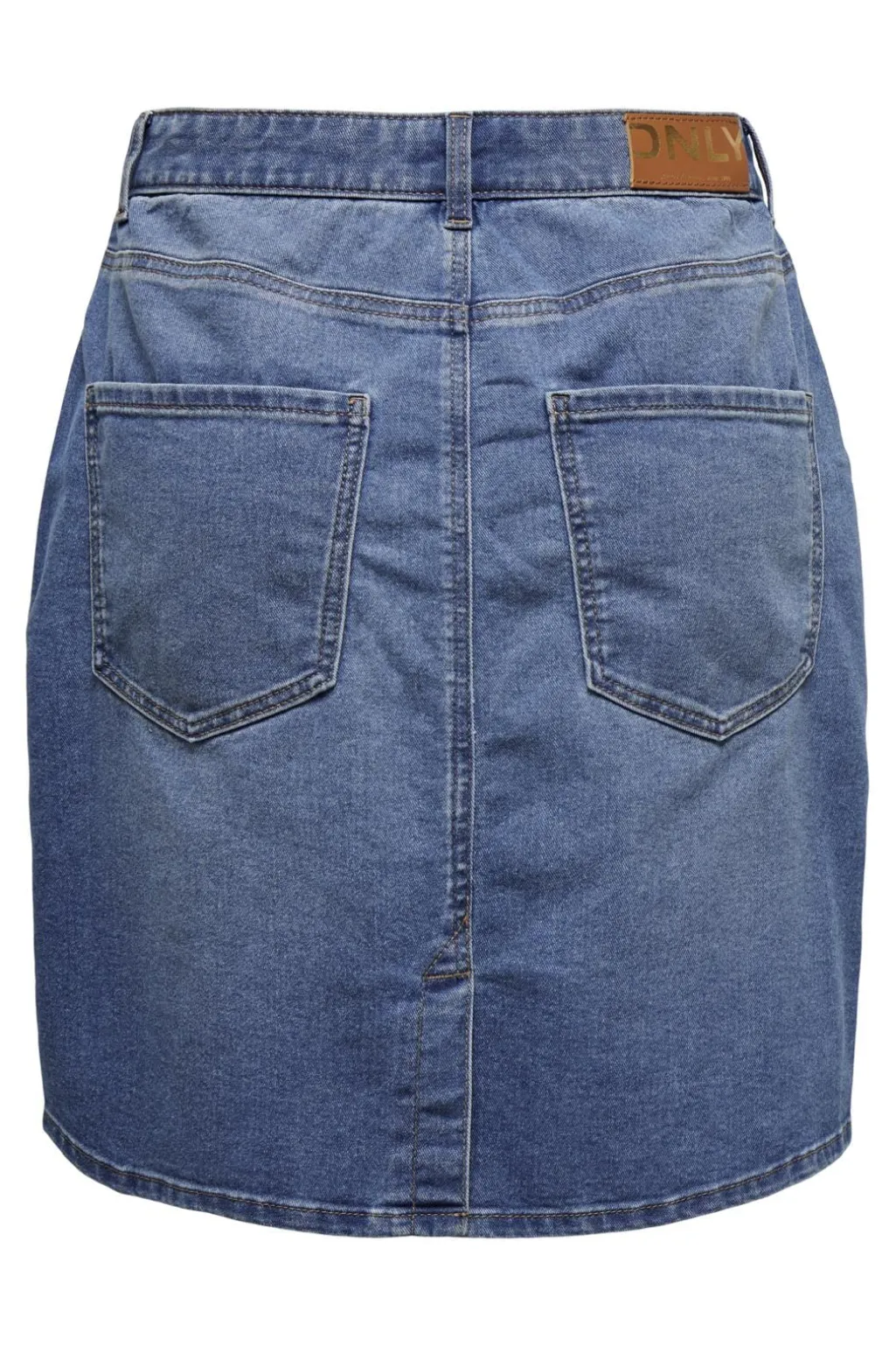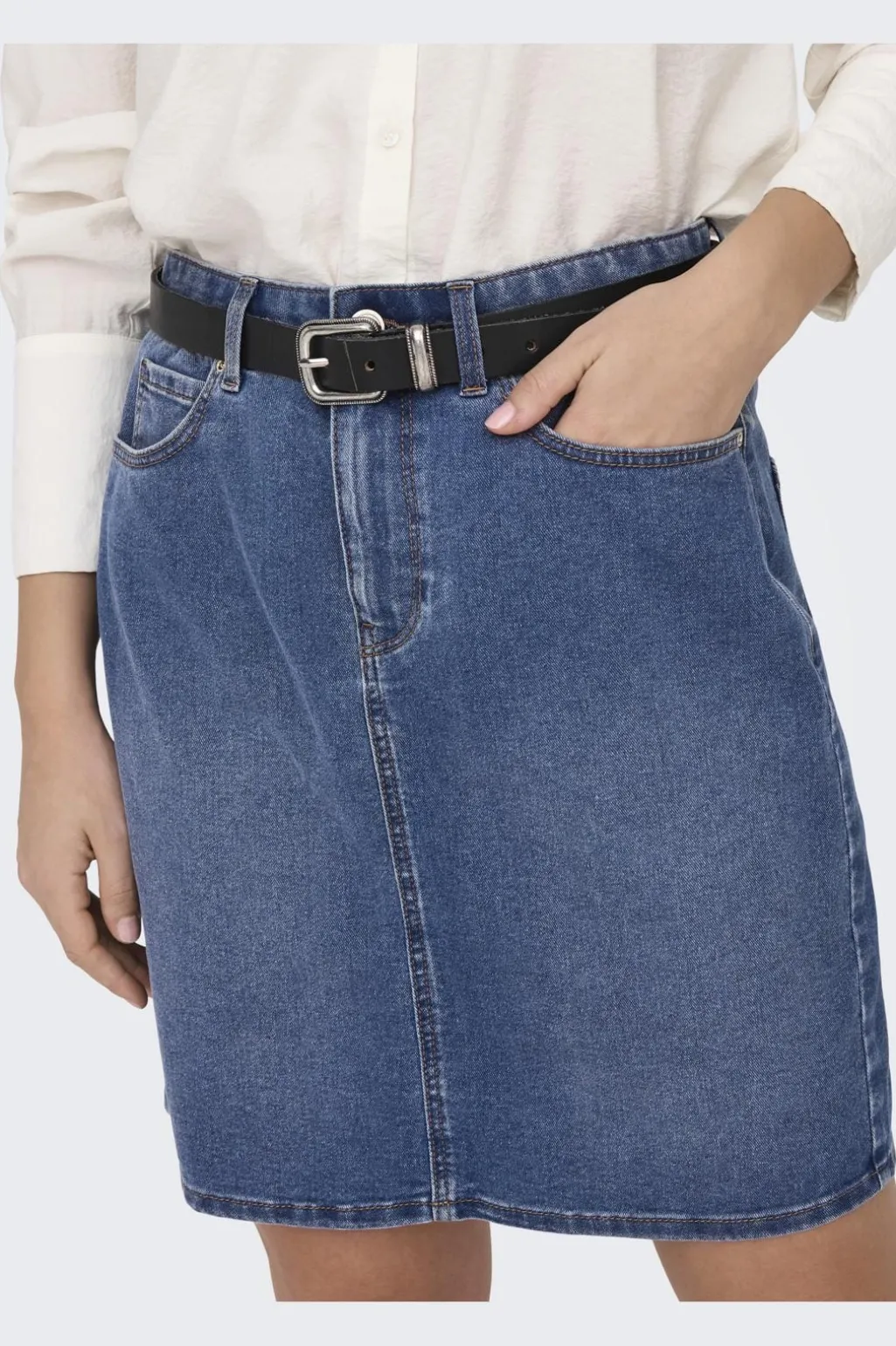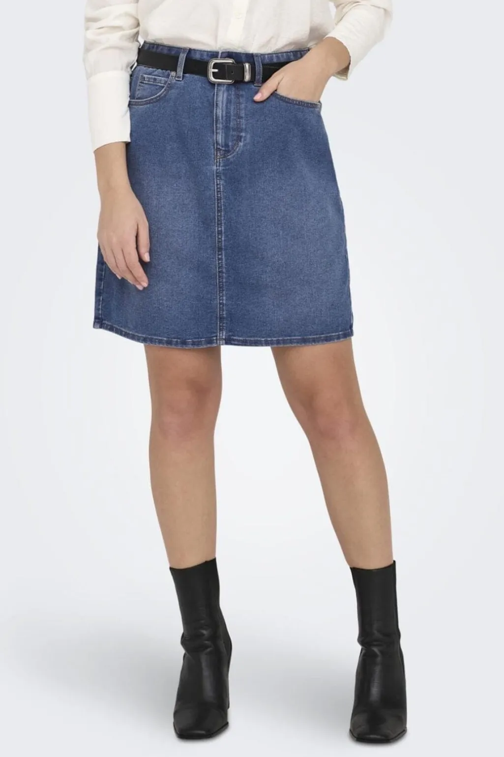 Denimnederdel fra Only i mellemblå. Den har høj talje med bæltestropper og praktiske lommer både foran og bagpå. Lynlås og knapper sikrer en god lukning.