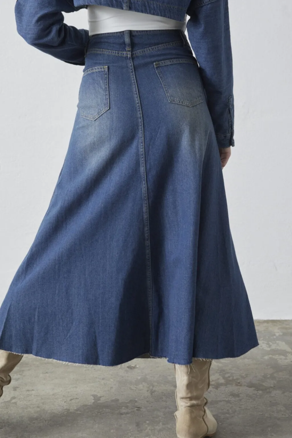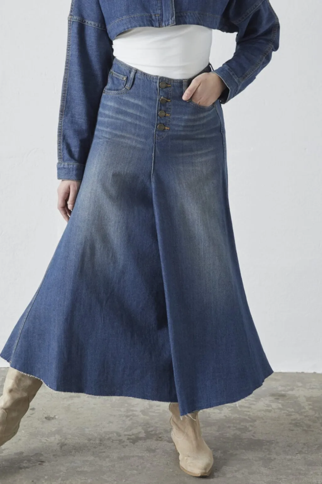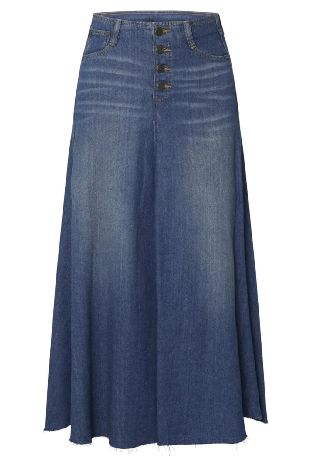 Lang denimnederdel fra Sisters Point i vintage wash. A-formet silhuet med fem knapper foran og praktiske lommer giver nederdelen et afslappet udtryk.