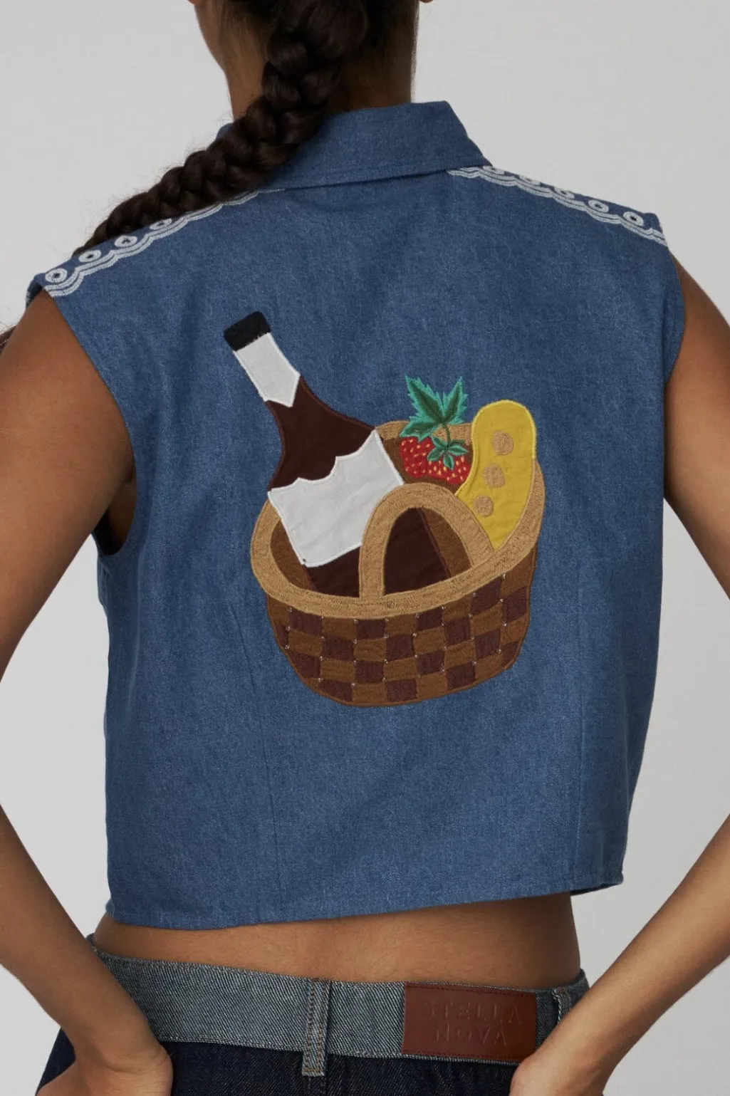 Ærmeløs top fra Stella Nova i sommerblå denim. Toppen har skjortekrave og broderede sommermotiver med isvaffel, parasol og tekst i rødt på forsiden.