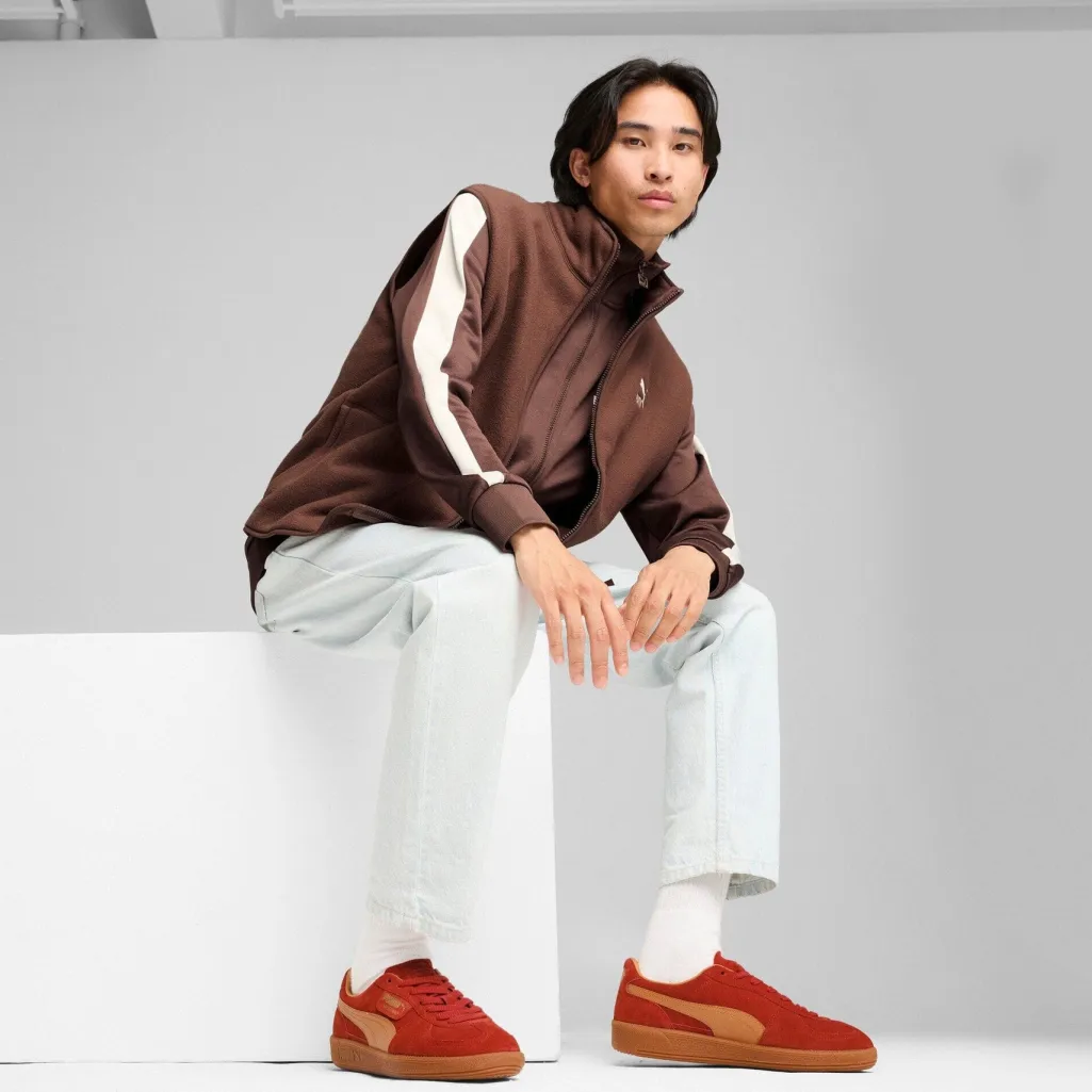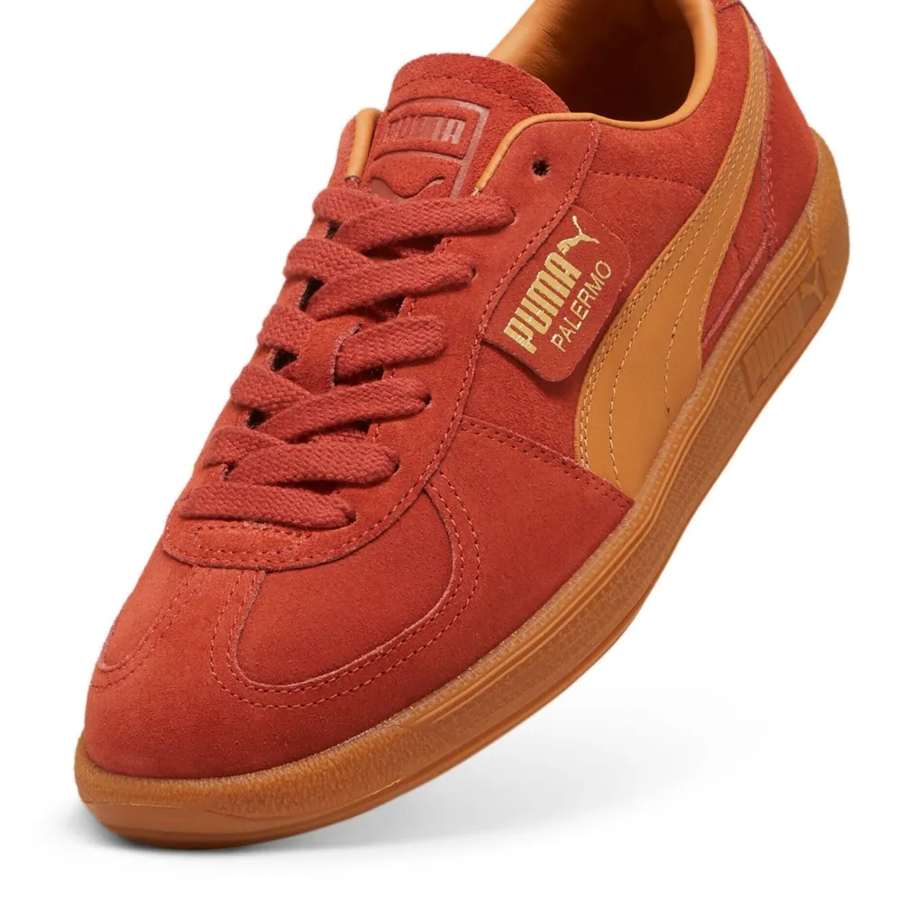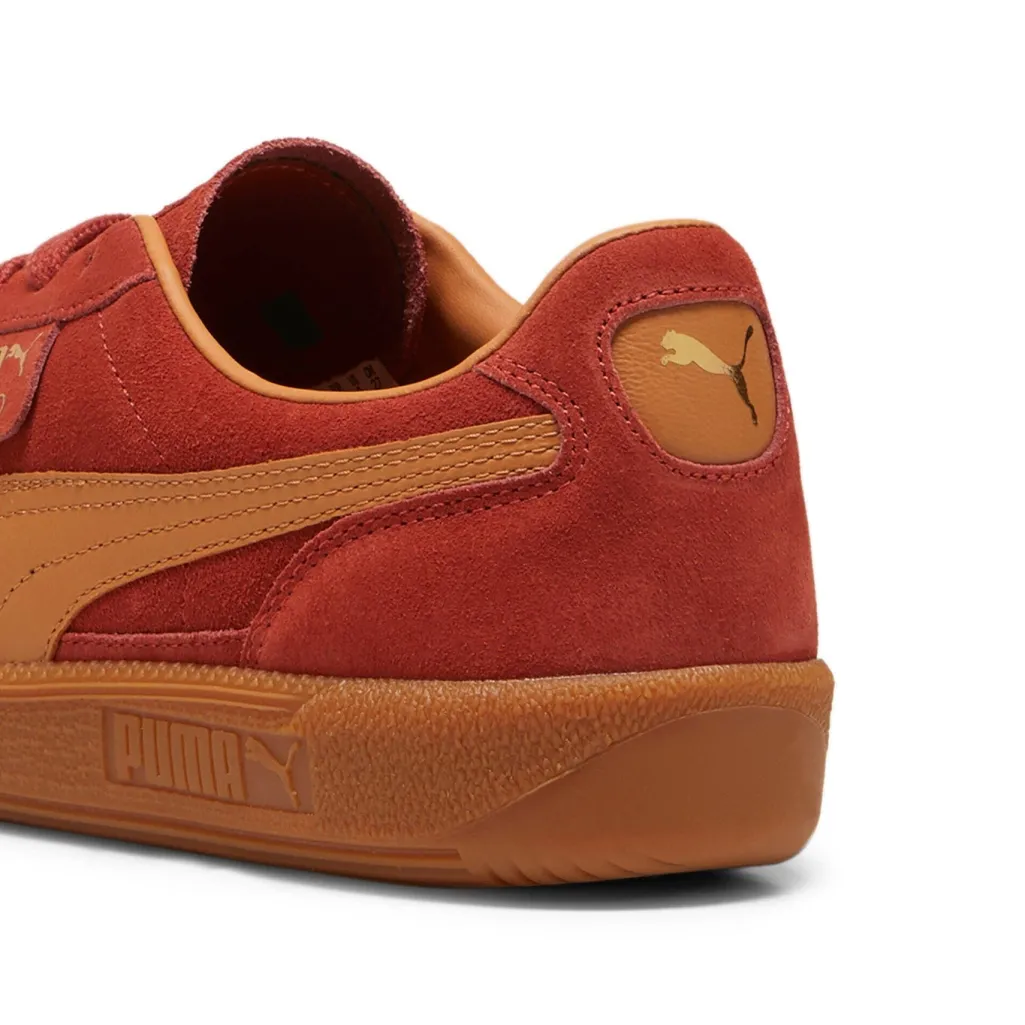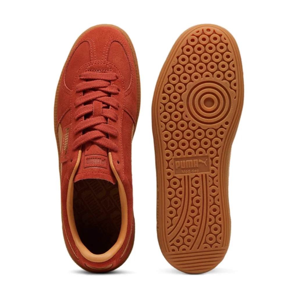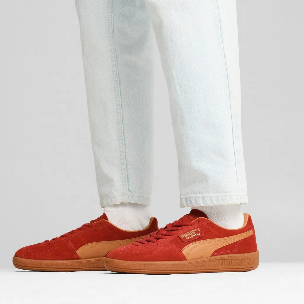 Rød sneaker fra Puma med overdel i ruskind og den klassiske formstribe i tan farve. Sneakeren har en rund tåform og en robust gummisål med cirkulært mønster.