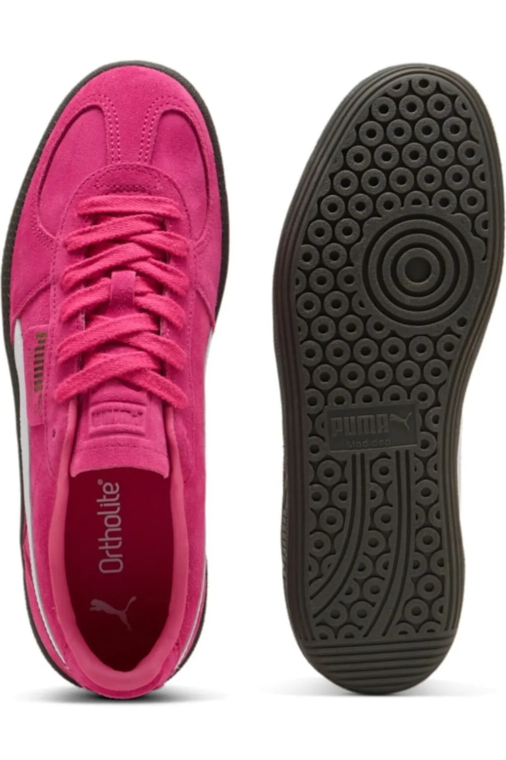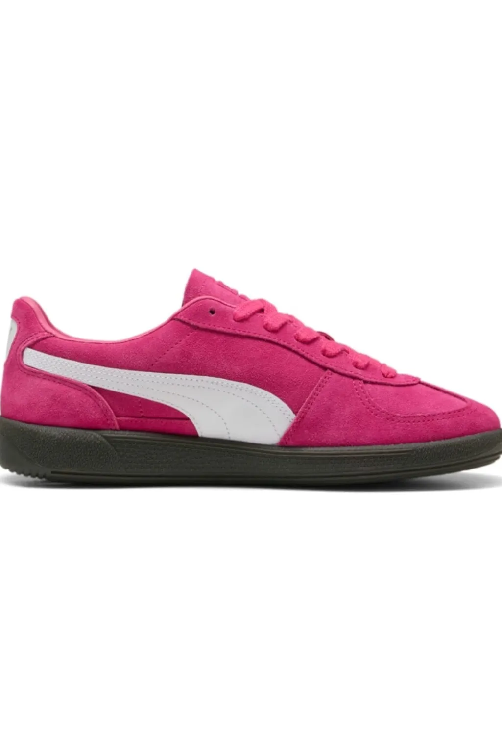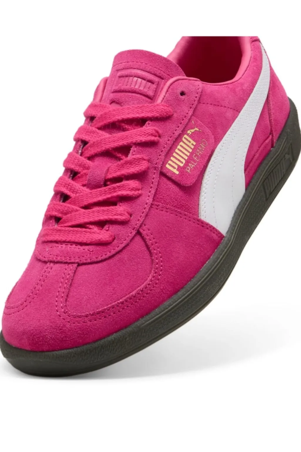 Pink sneakers fra Puma med hvide detaljer. Skoene har en overdel i læder og en sort gummisål, der giver god støtte til foden.