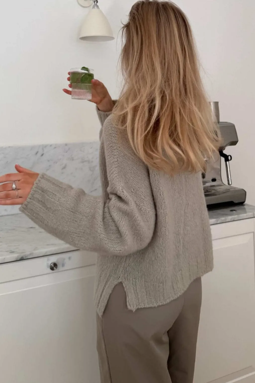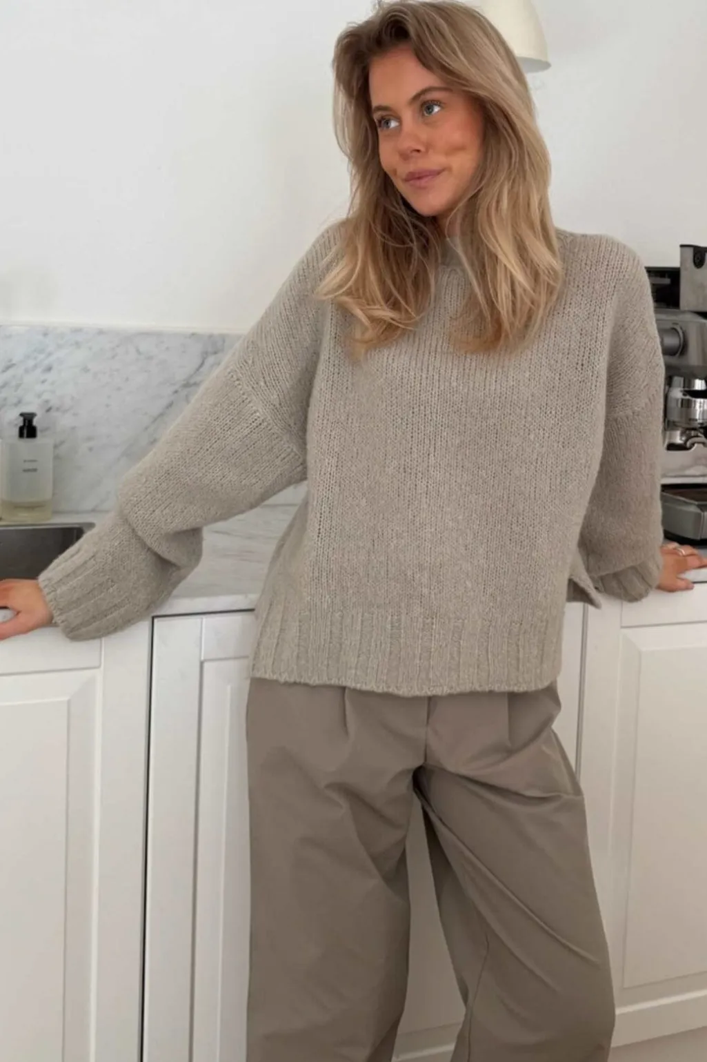 Beige pullover fra BYIC med løs pasform og lange ærmer. Den er strikket i en blød blanding af mohair og uld med ribkanter ved ærmerne og bunden.