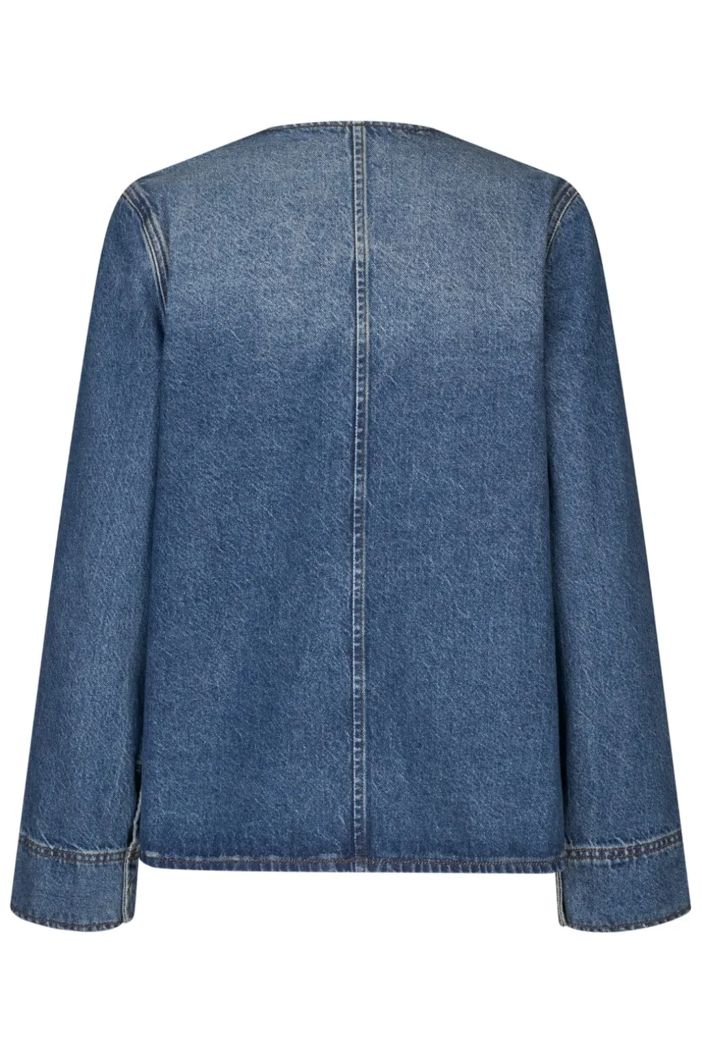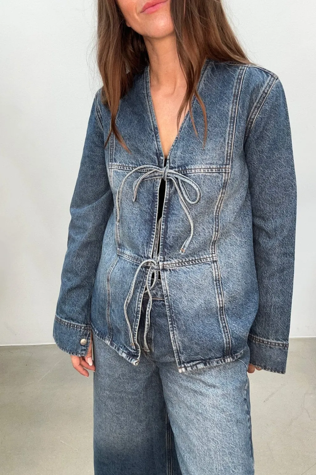 Denimjakke fra Global Funk i lys til mellemblå vask. Jakken har en løs pasform med V-udskæring og lange ærmer. Bindebåndsdetaljerne foran giver mulighed for at tilpasse pasformen.