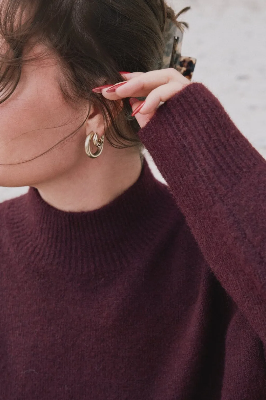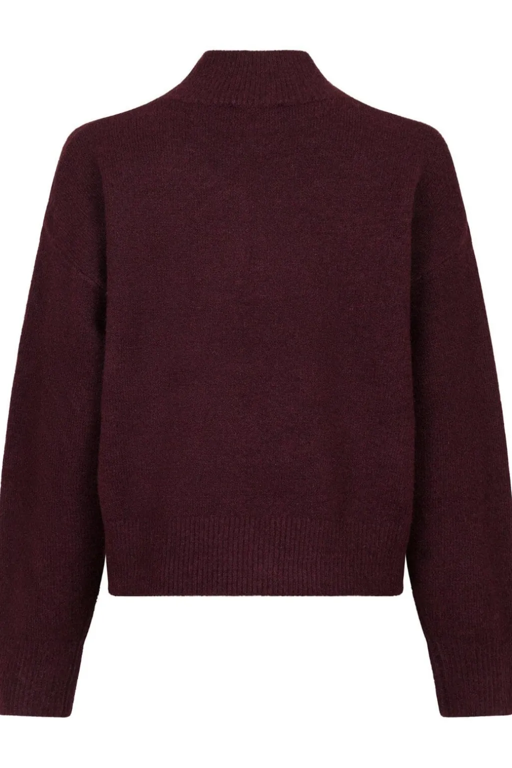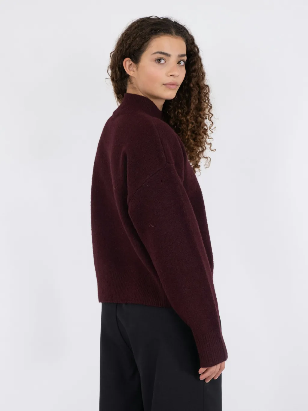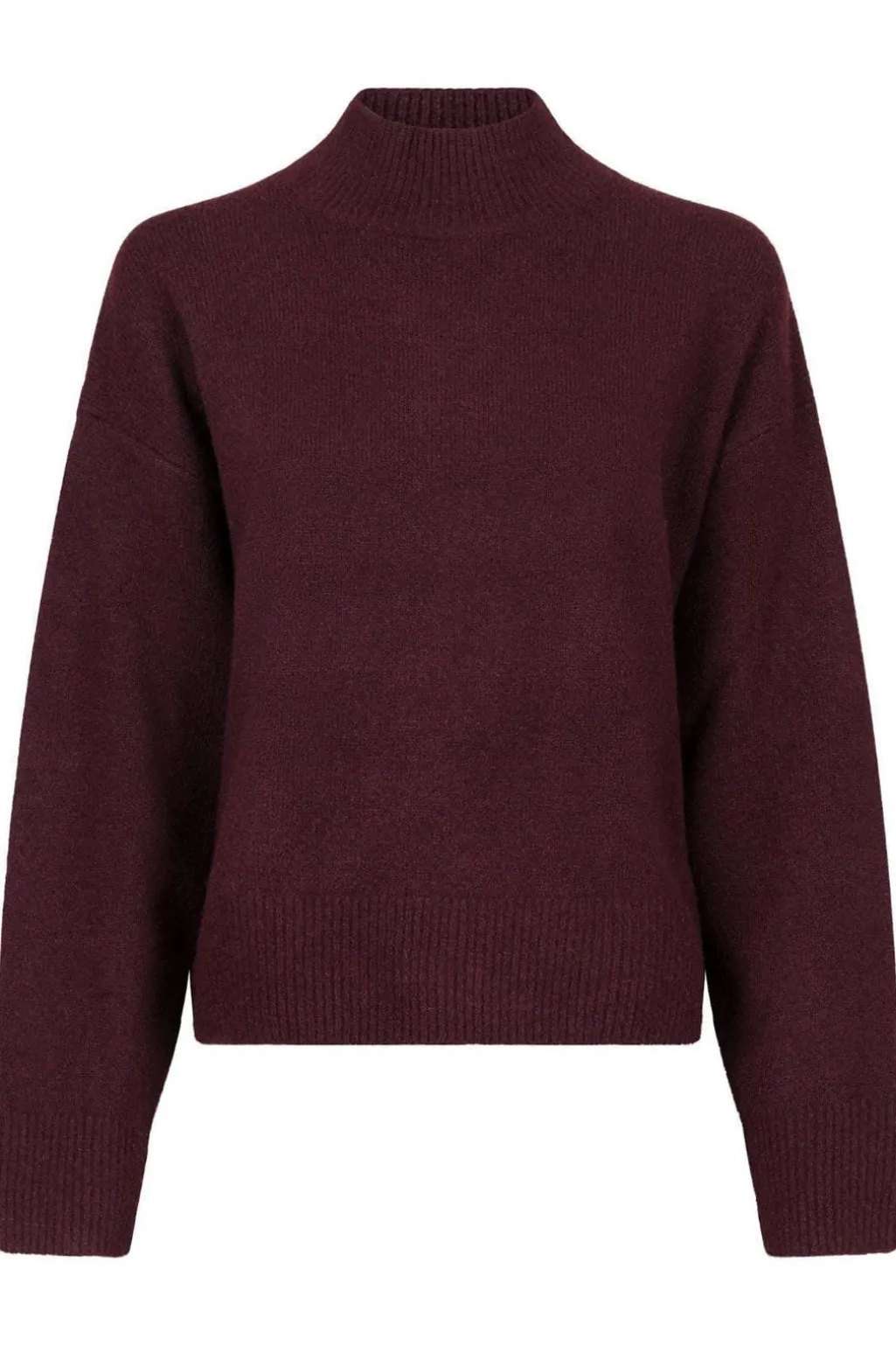 Vinrød strikbluse fra Neo Noir med høj hals. Den løse pasform og de brede ærmer giver en afslappet stil, mens den strikkede tekstur skaber dybde i designet.