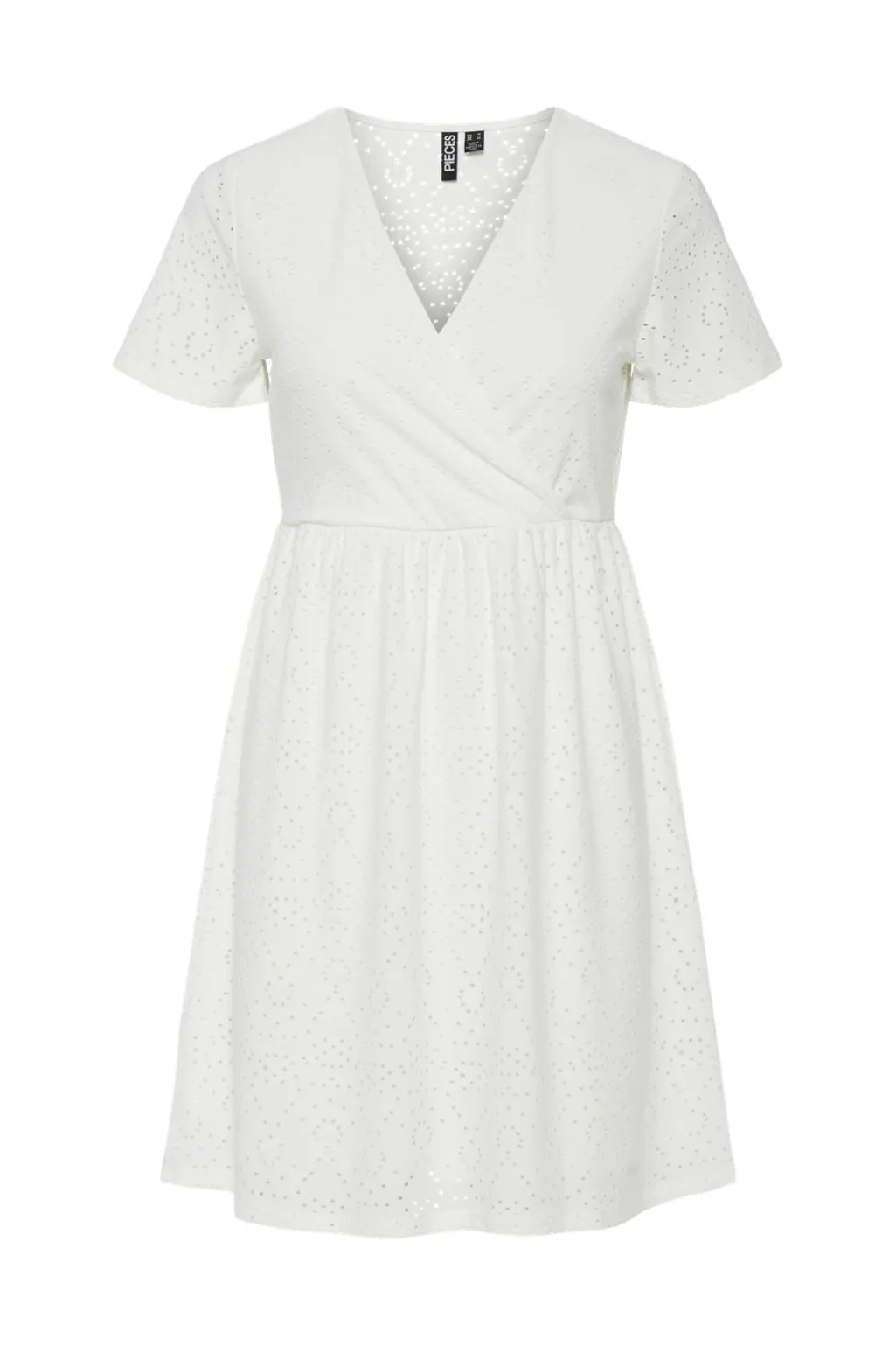Hvid kjole fra Pieces med broderie anglaise-mønster. Kjolen har V-hals, 3/4-ærmer og elastisk talje med regular fit. Halvforet model i let og luftigt stof.