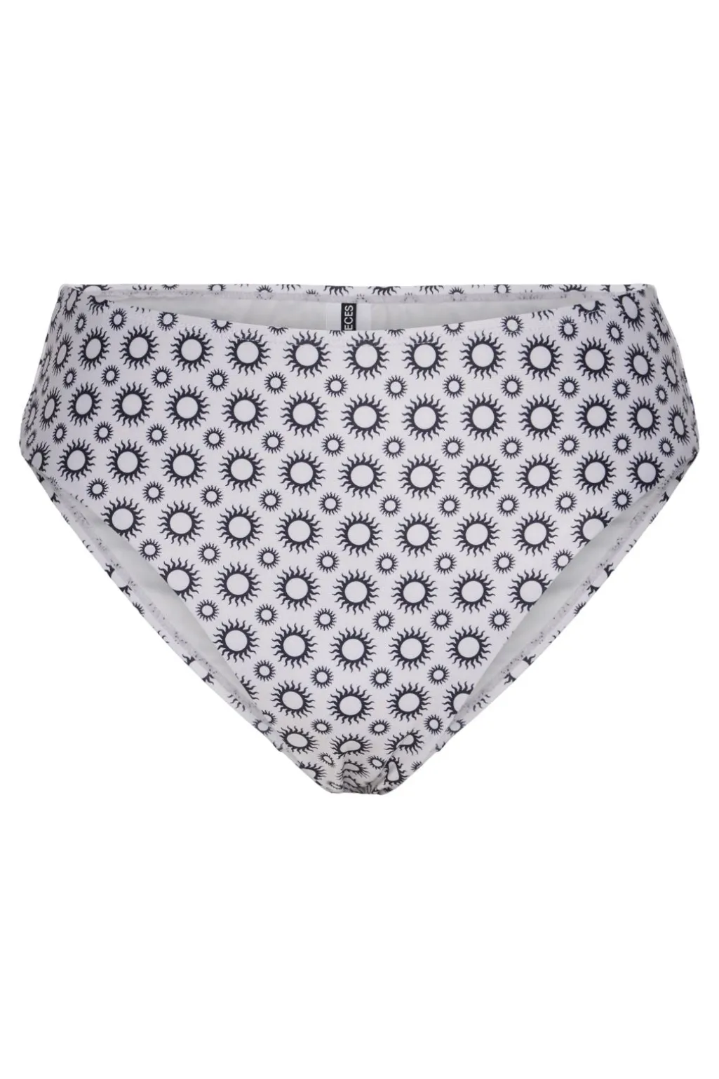 Højtaljede bikinitrusser fra Pieces med et gennemgående solprint på hvid baggrund. Designet har en høj talje og er fremstillet med fokus på komfort og støtte.