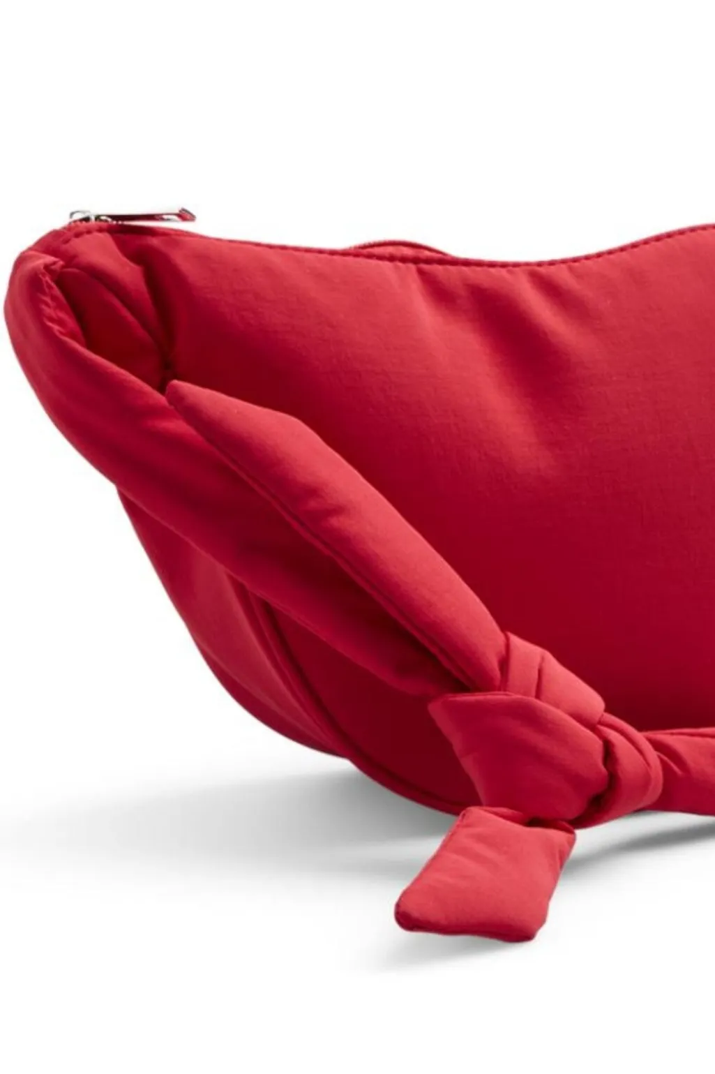 Rød bumbag fra Pieces med knudedetalje på siden. Tasken er lavet i nylon og har både en inderlomme og lynlåslukning. Knuden på siden giver tasken et særpræg.