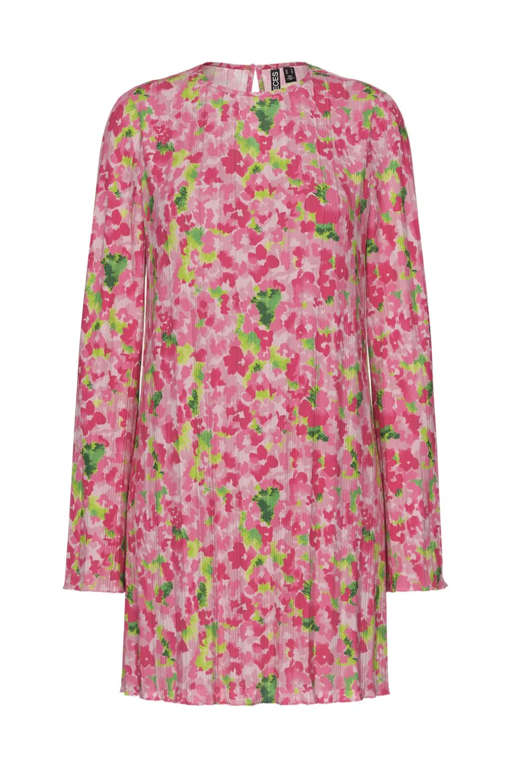 Kort kjole fra Pieces med plissering og blomsterprint. Den plisserede kjole har rund hals og lange ærmer med volumen. Printet består af pink og grønne blomster på hele overfladen.