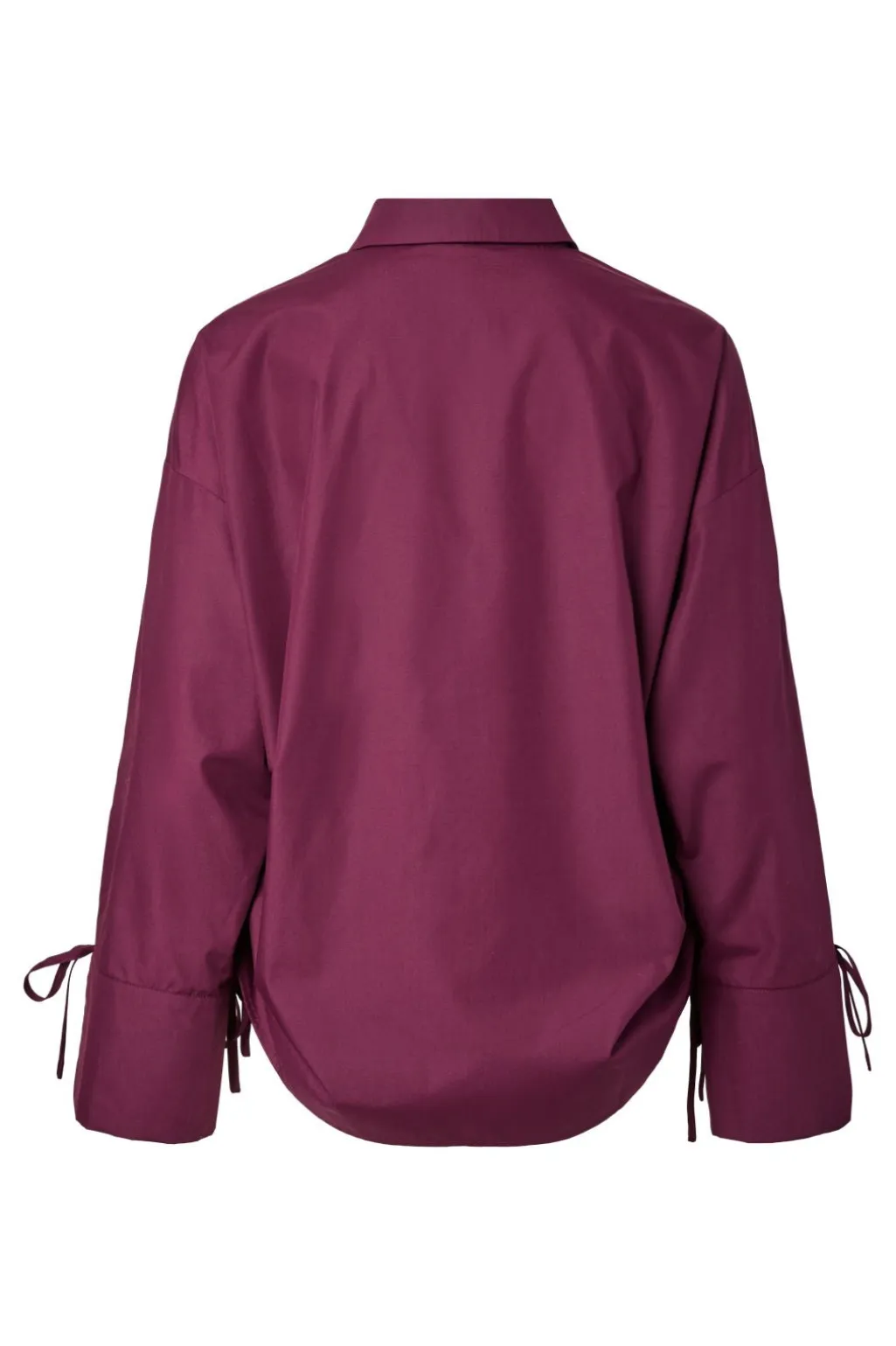 Mørkelilla skjorte fra Pieces med skjortekrave og løs pasform. Skjorten har lange ærmer med dekorative bånd og knaplukning foran.