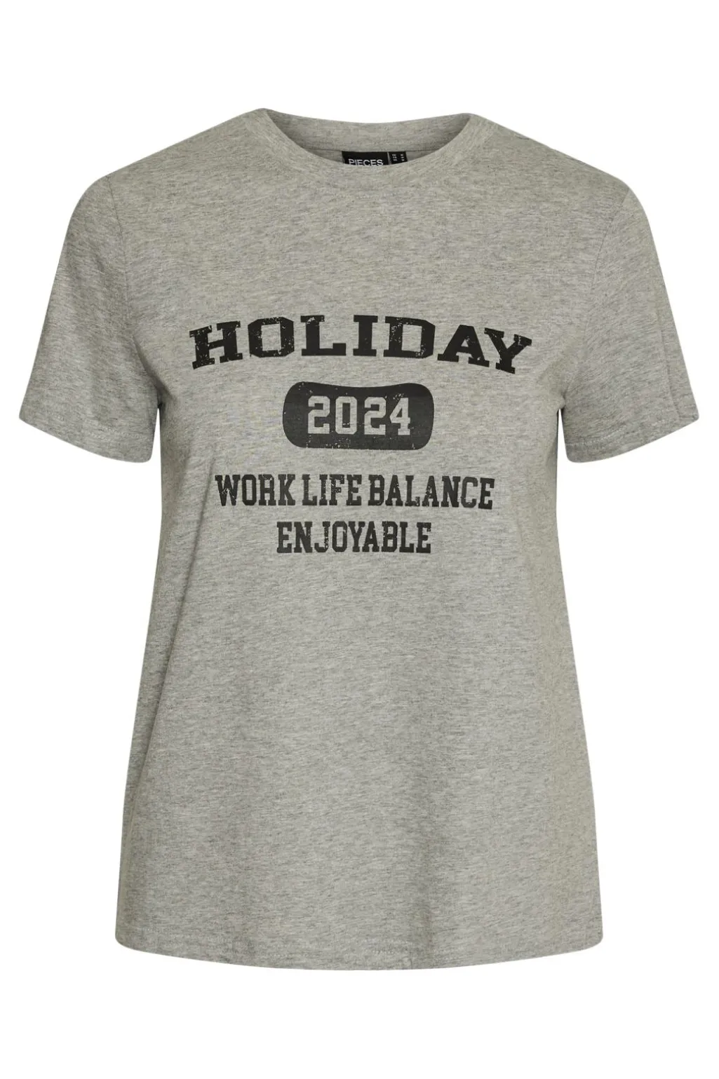 Lysegrå t-shirt fra Pieces i meleret bomuld. T-shirten har et sort tekstprint på forsiden med ordene HOLIDAY 2024 WORK LIFE BALANCE ENJOYABLE.