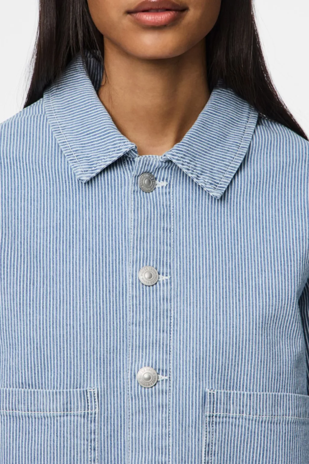 Lyseblå denimjakke fra Pieces med hvide striber. Jakken har skjortekrave, lange ærmer og trykknapper. Det stribede mønster giver et maritimt præg.
