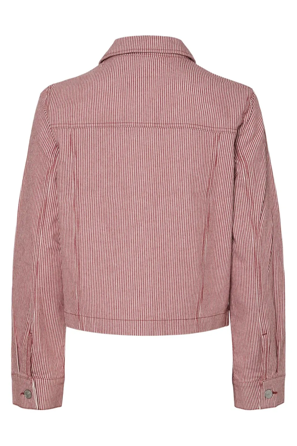 Stribet denimjakke fra Pieces med rød-hvidt mønster. Jakken har skjortekrave, lange ærmer og knaplukning foran. To praktiske lommer på forsiden giver jakken et klassisk udtryk.