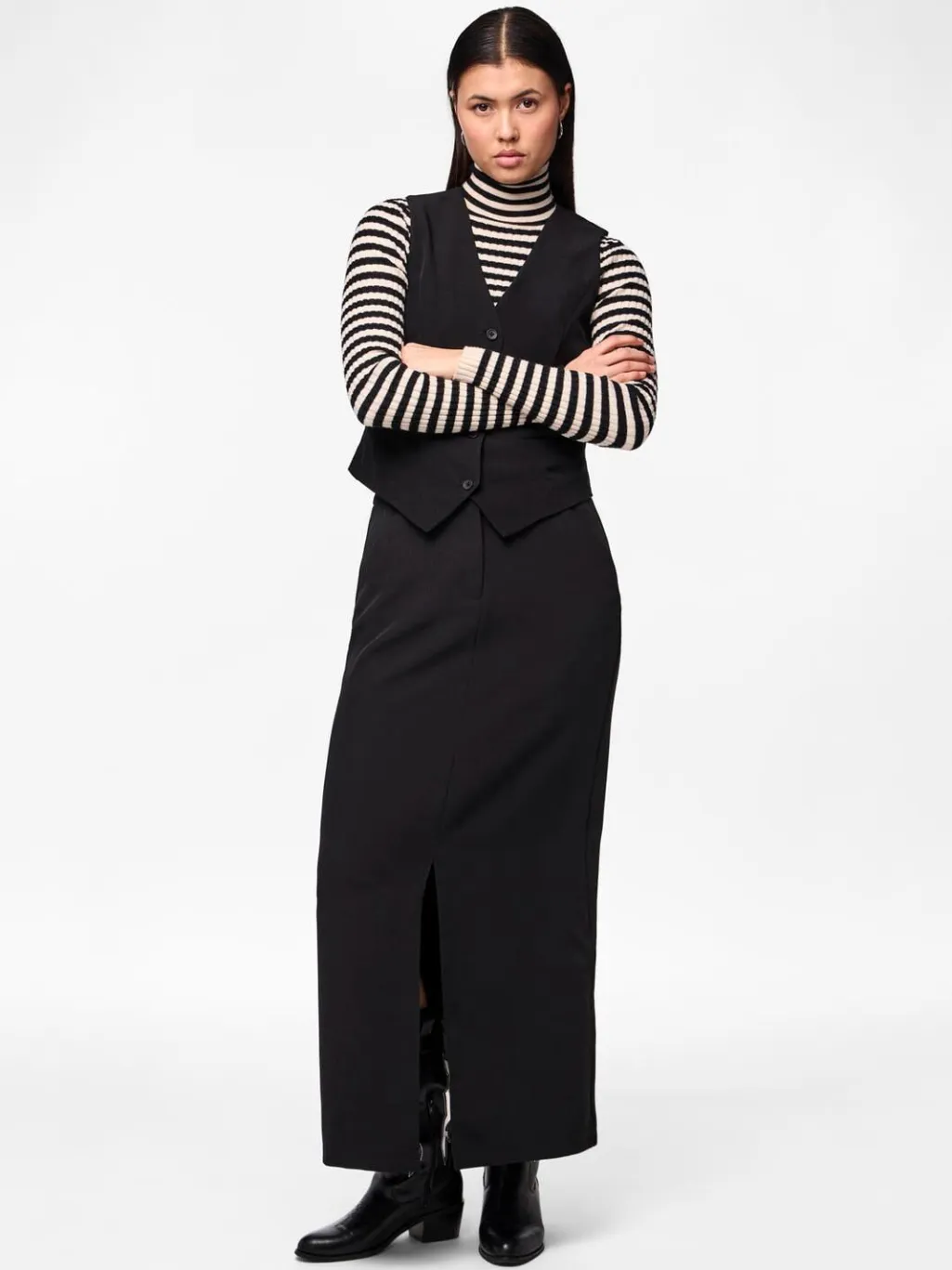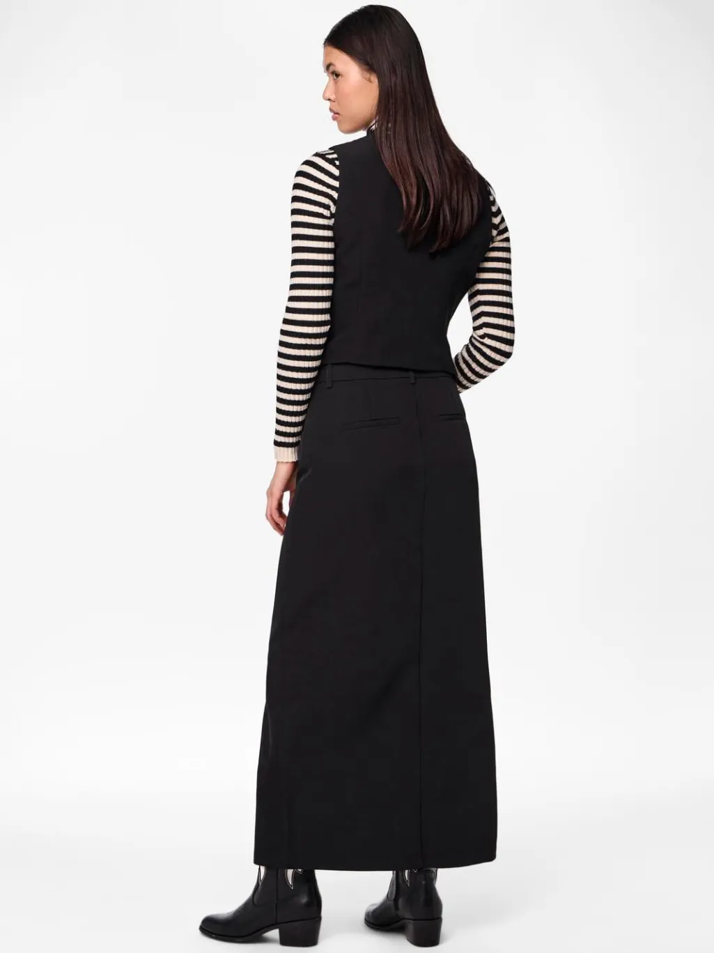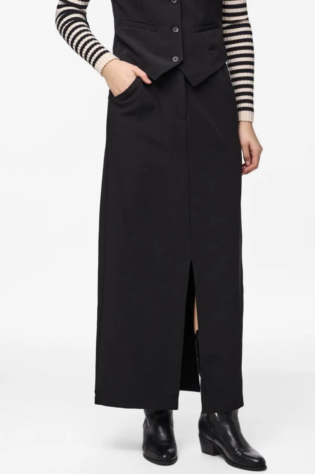 Sort ankelnederdel fra Pieces med høj talje og frontslids. Nederdelen har en regular fit og kan styles til både hverdag og fest.