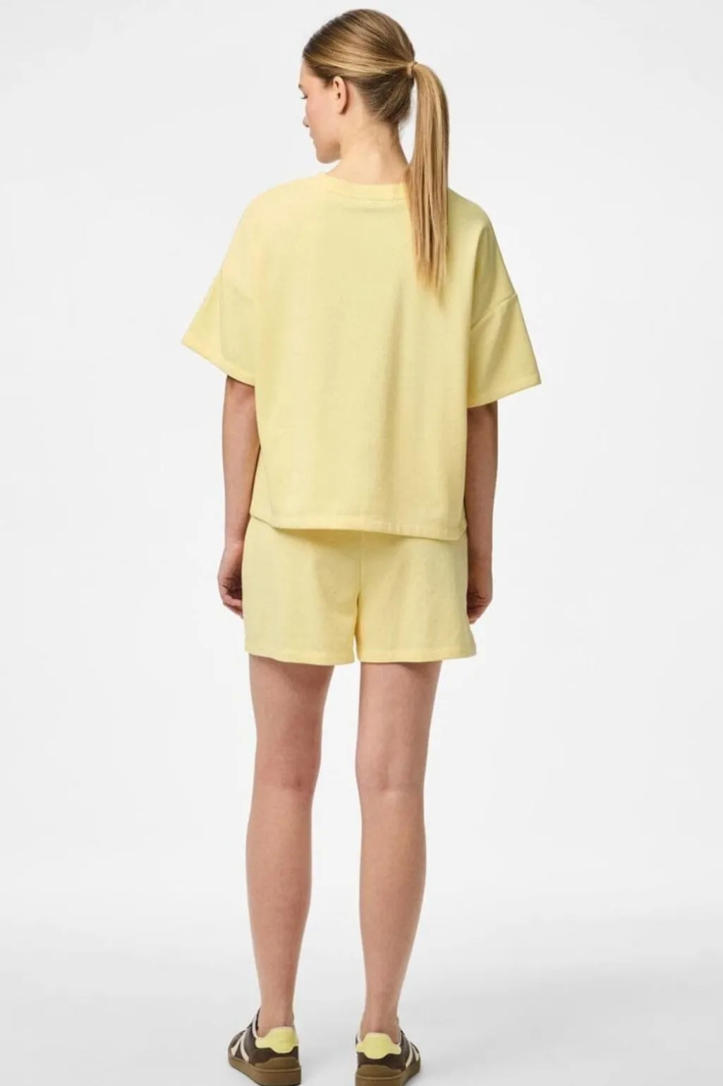 Lyse gule shorts fra Pieces med høj talje og snøredetalje. Shortsene har en almindelig pasform i lårlængde og er fremstillet af en blød og behagelig jersey.
