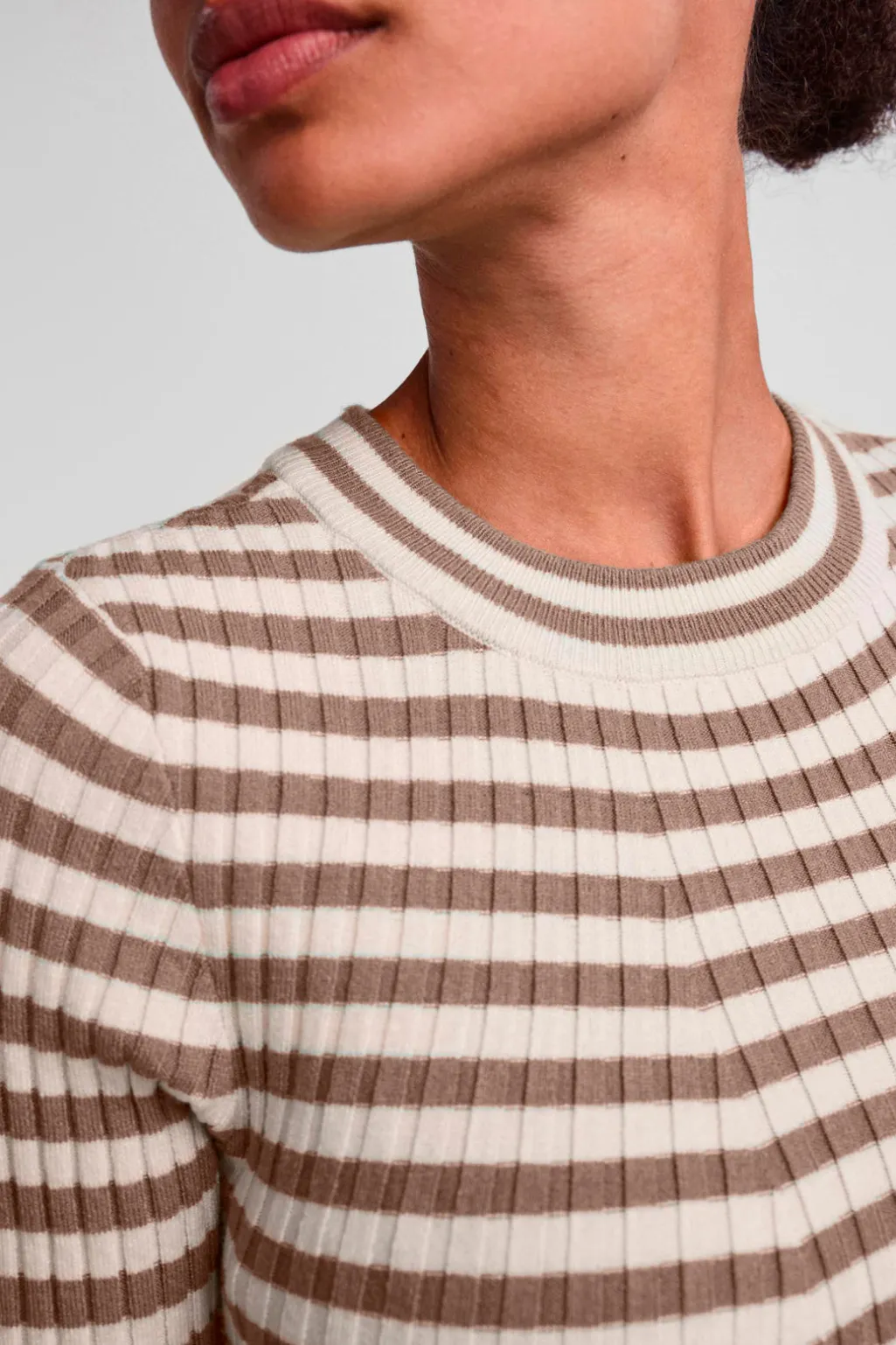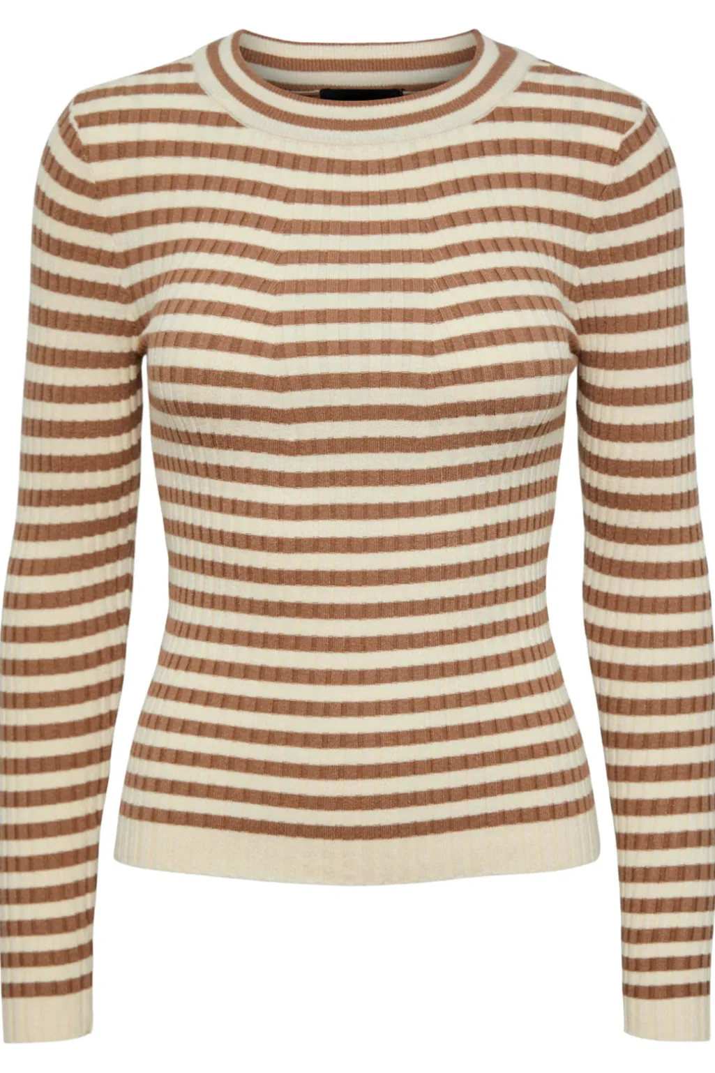 Stribet striktrøje fra Pieces med brune og cremefarvede vandrette striber. Ribstrikket design med rund hals og lange ærmer giver trøjen et struktureret udtryk.