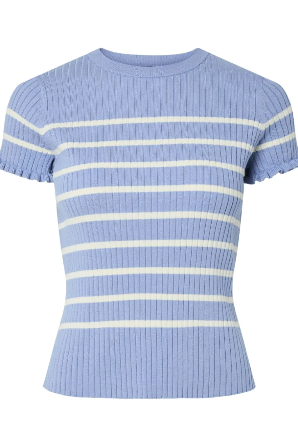 Kortærmet strikket top fra Pieces i kornblomstblå med hvide striber. Toppen har en ribbet tekstur, rund halsudskæring og bølgede kanter på ærmerne, hvilket giver et feminint præg.