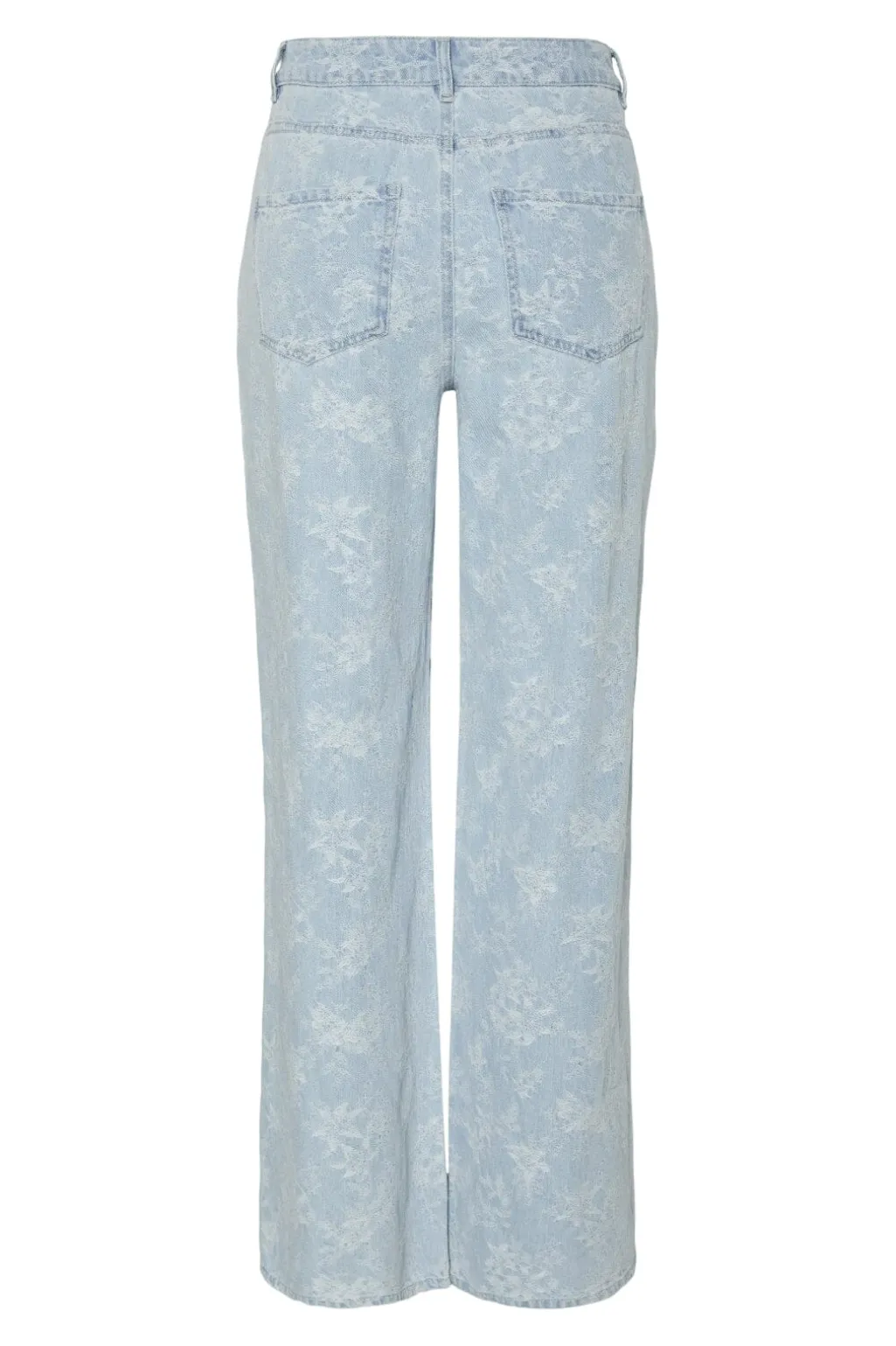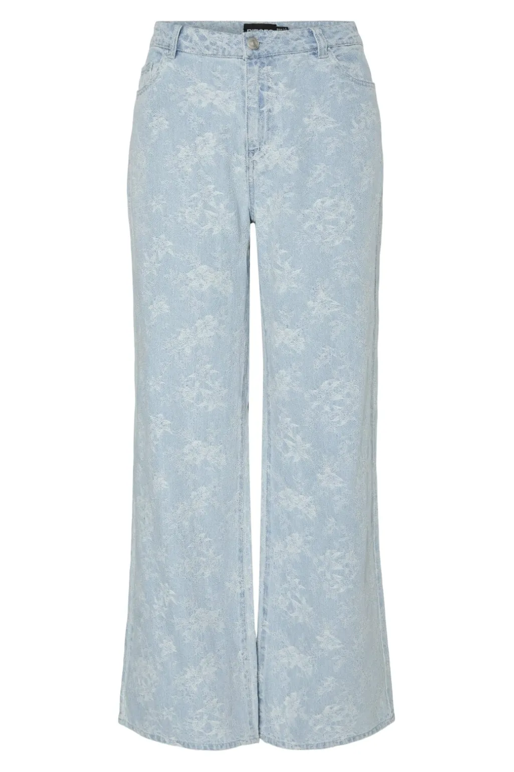 Lyseblå denimjeans fra Pieces med blomsterprint over hele overfladen. Jeansene har en wide leg-model med tætsiddende hofte og vidde i benene samt mellemhøj talje.