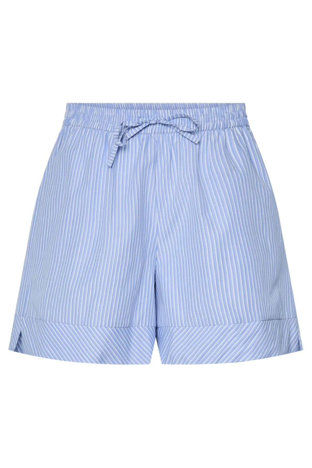 Stribede shorts fra Pieces med et blåt og hvidt mønster. Shortsene har en elastisk talje med snor og en løs pasform.