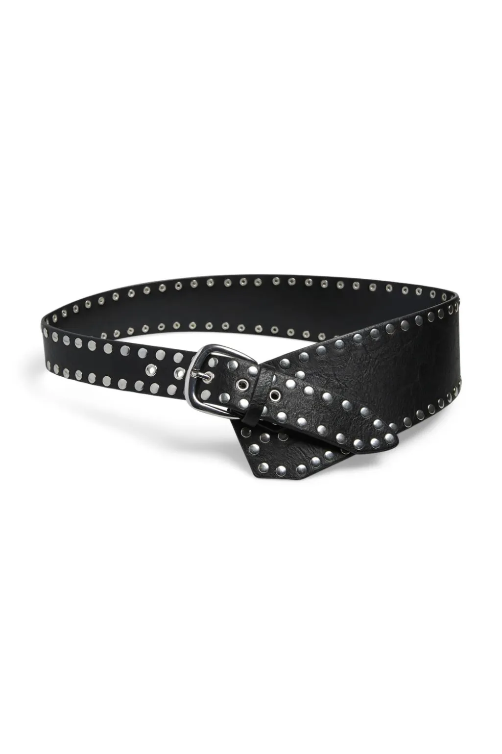 Sort bælte fra Pieces med sølvfarvede nitter langs hele længden. Bæltet har en klassisk metalspænde og et boho-inspireret design med spids ende.