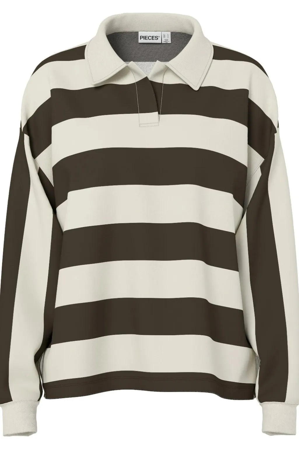 Stribet polo-skjorte fra Pieces i brun og beige. Skjorten har brede horisontale striber og en klassisk polo-krave med knaplukning.