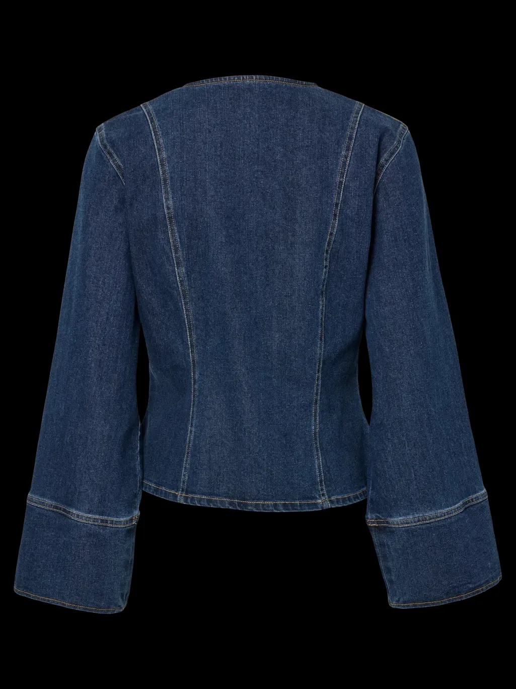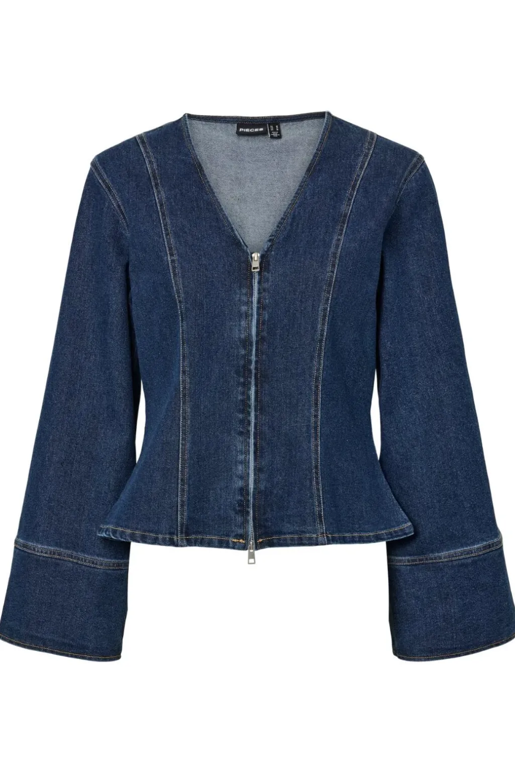 En mørkeblå denimskjorte fra Pieces med lynlåslukning. Skjorten har lange ærmer med vidde og en V-udskæring, der giver et afslappet udtryk.