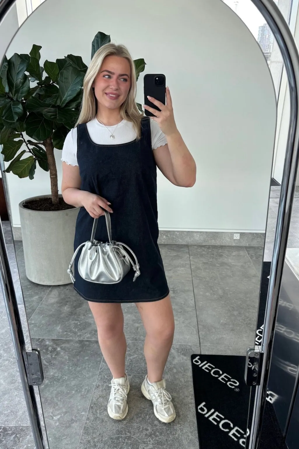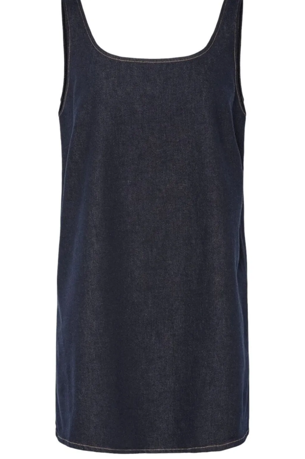 Mørkeblå denimkjole fra Pieces med firkantet halsudskæring. Kjolen har et ærmeløst design og dekorative syninger, der fremhæver denim-materialet.