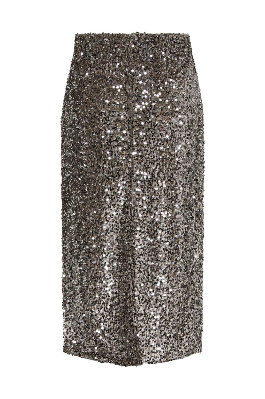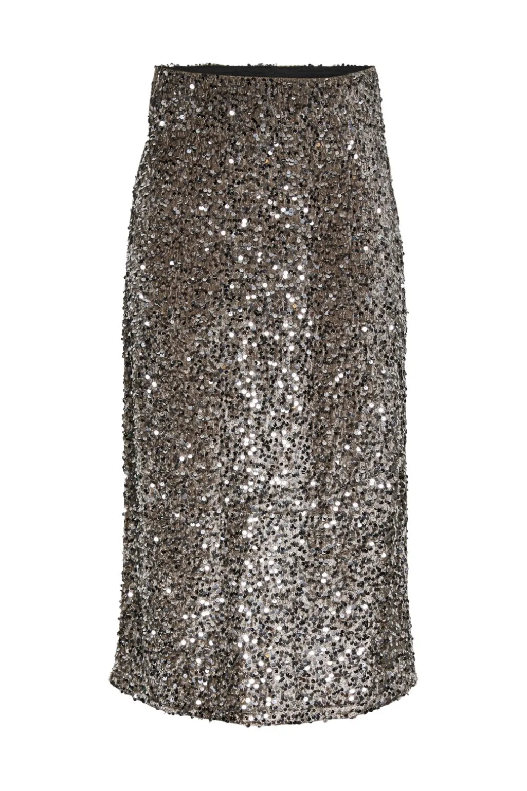 Sølvfarvet midi-nederdel fra Pieces med paljetter over det hele. Den har høj talje og når til midt på læggen. Nederdelen har en lige skæring og sidder tæt til kroppen.