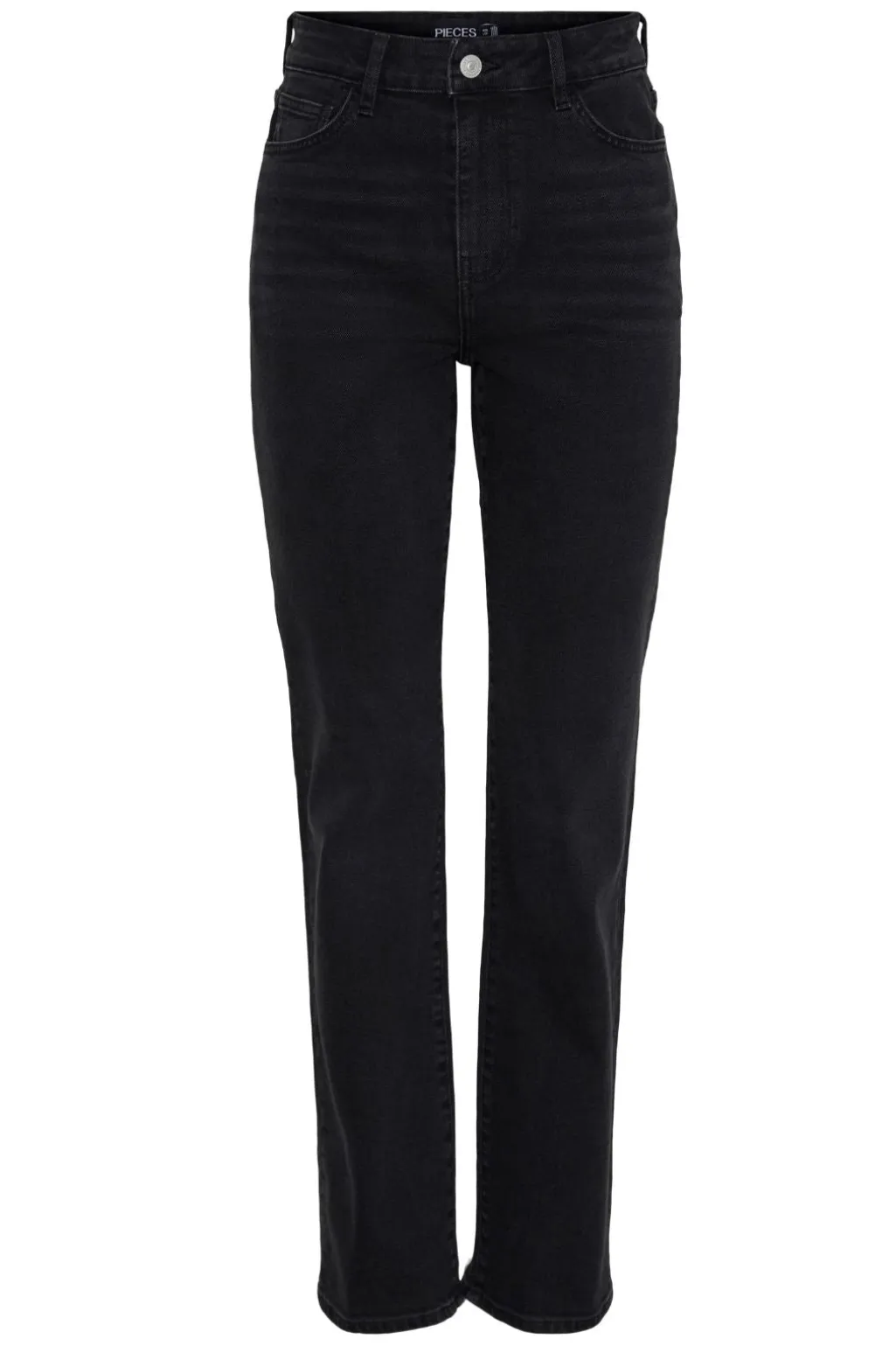 Sorte straight jeans fra Pieces med lige ben og almindelig talje. Bukserne har en dyb sort farve og en klassisk pasform, der passer til mange forskellige outfits.