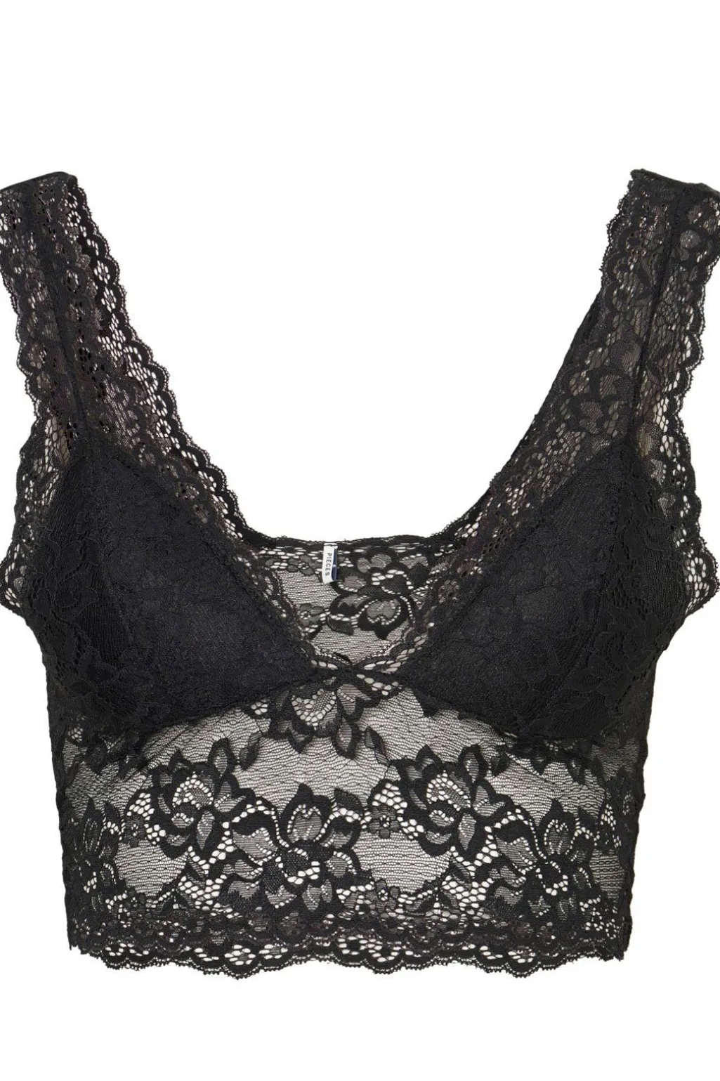 Sort bh fra Pieces med blomstermønstret blonde. Bh’en har brede blondestropper og et detaljeret blomsterdesign, der går igen i hele modellen.