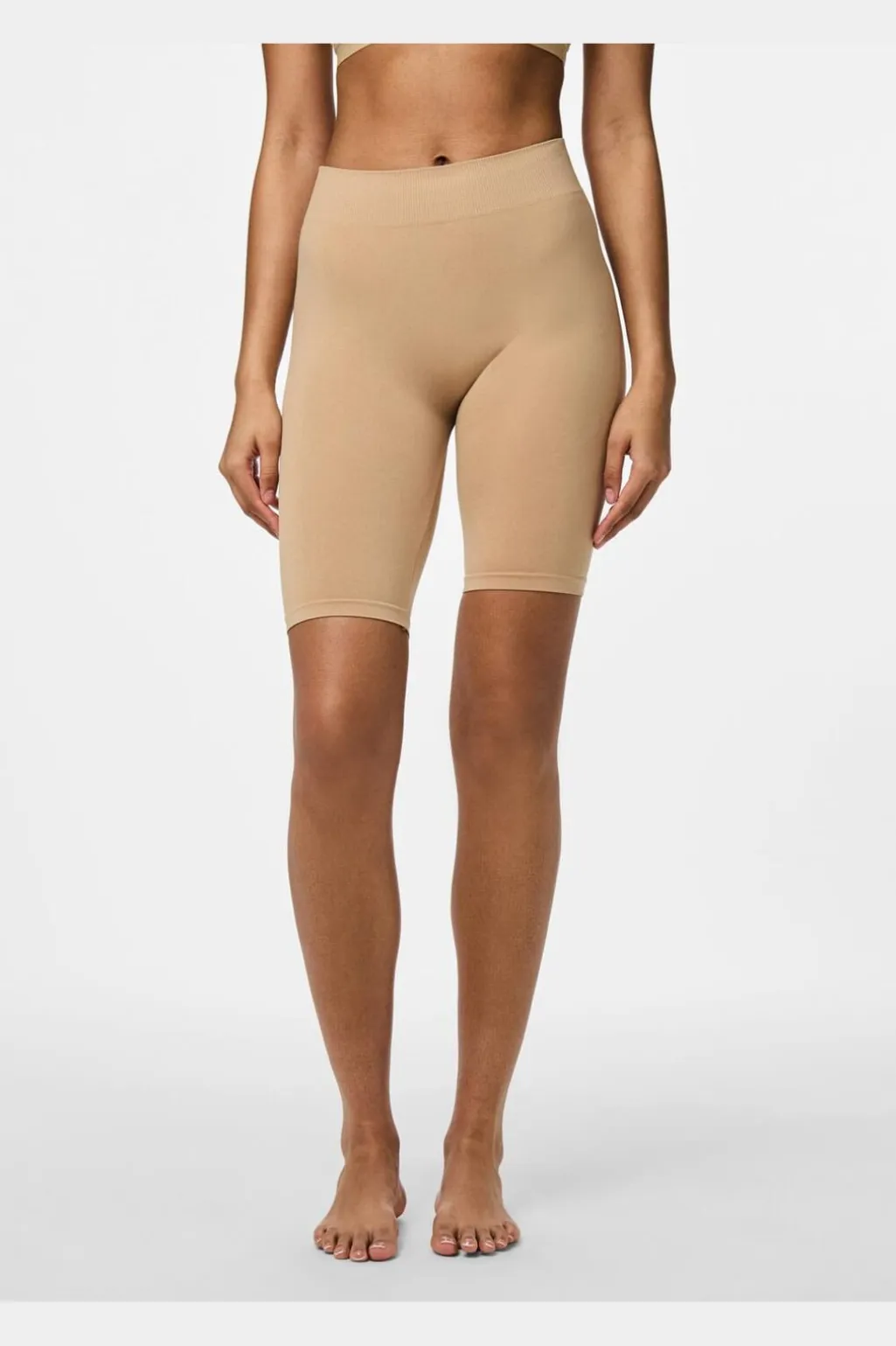 Beige shorts fra Pieces med elastisk talje og stretchmateriale. Shortsene har en slim fit og er lårkorte, hvilket gør dem velegnede til at style under kjoler og nederdele.