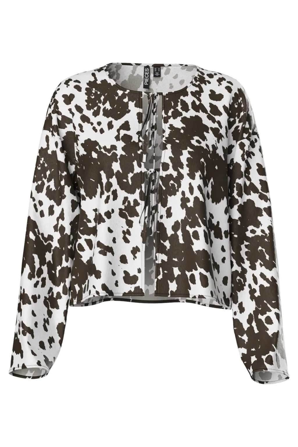 Langærmet top fra Pieces med brun og hvidt ko-print. V-udskæring med bindebånd giver mulighed for at justere åbningen. Regular fit med et afslappet snit.
