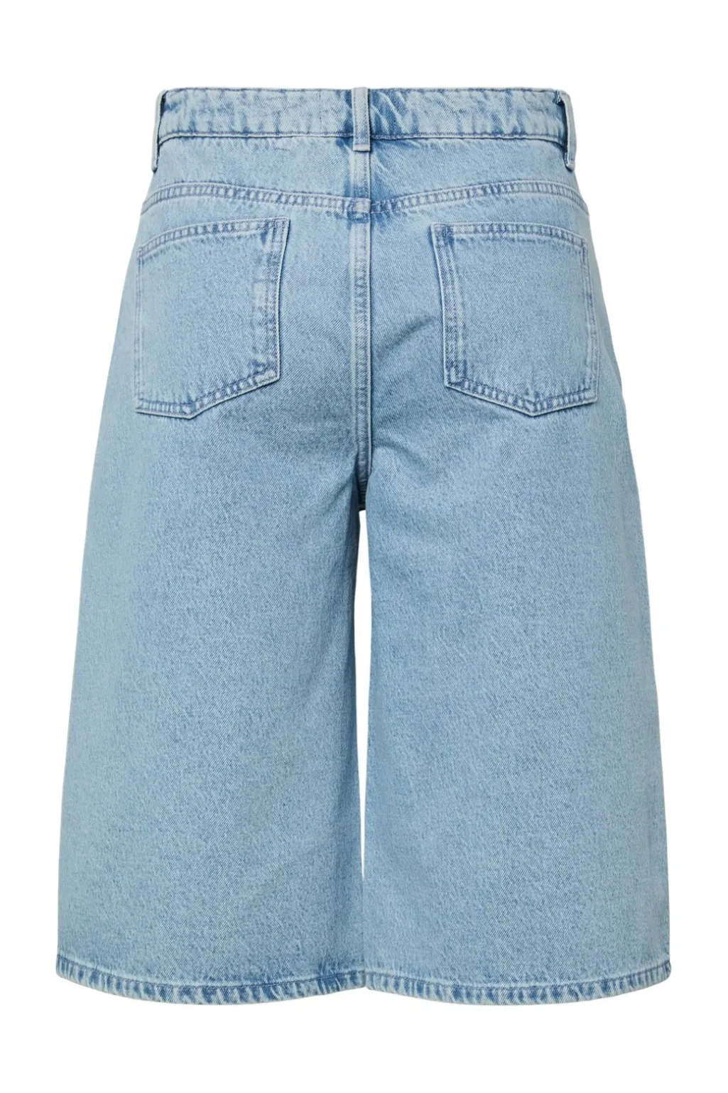Lys blå denimshorts fra Pieces med rhinsten-dekorationer. Shortsene har en loose fit og knælængde med praktiske lommer både foran og bagpå.