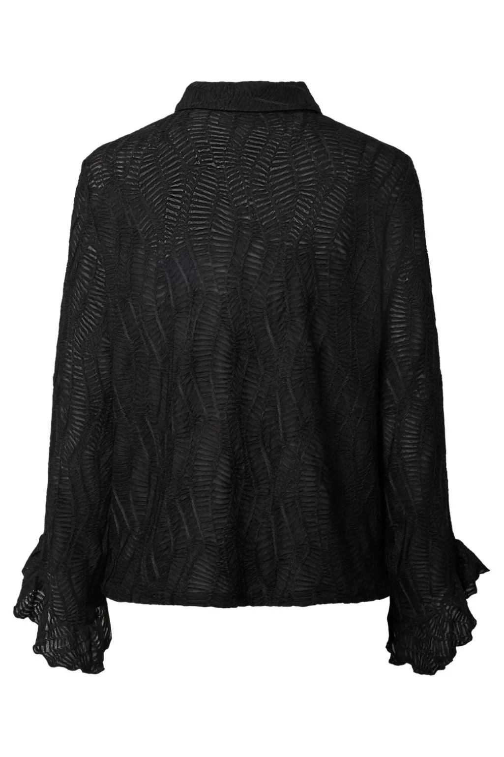 Sort skjorte fra Pieces med mønstrede design. Skjorten har en klassisk krave og knappestolpe foran. De lange ærmer har flæsedetaljer ved manchetterne.
