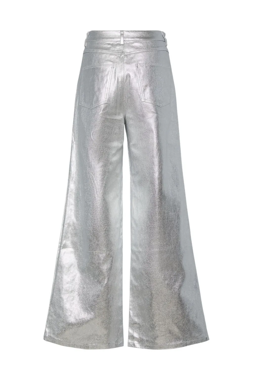 Sølvfarvede bukser fra Pieces med brede ben. Bukserne har en skinnende overflade og en løs pasform, der giver god bevægelsesfrihed.