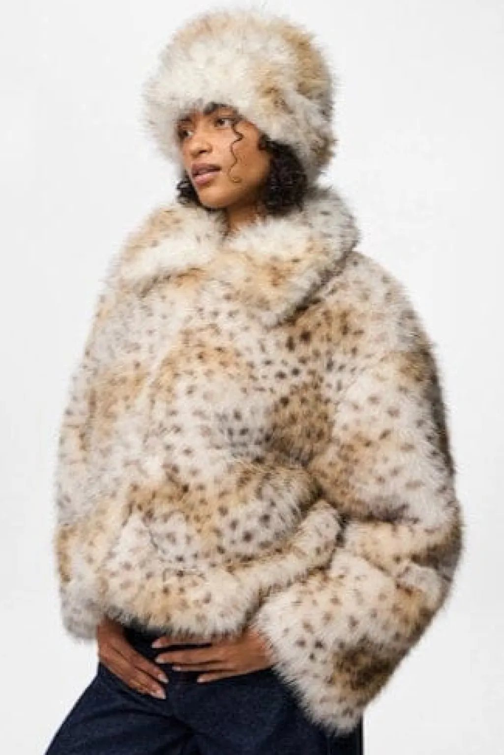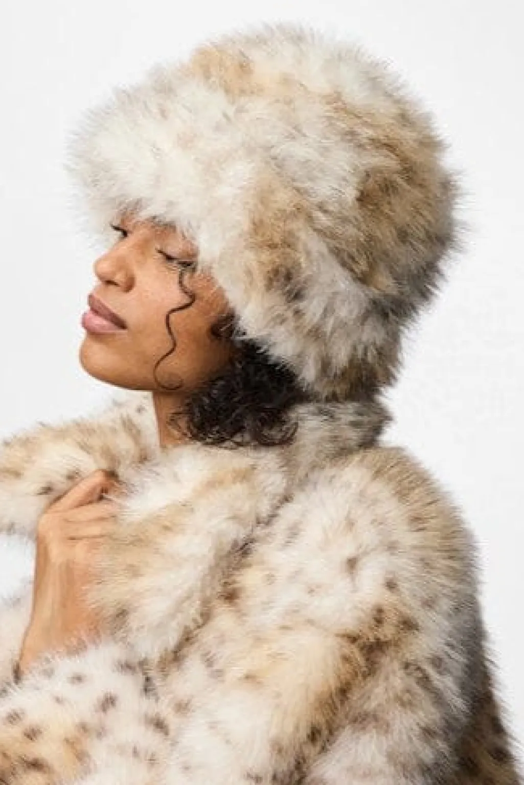 Hat fra Pieces med leopardlignende mønster i brune nuancer på en hvid og creme bund. Den fluffy tekstur giver hatten et blødt udtryk.