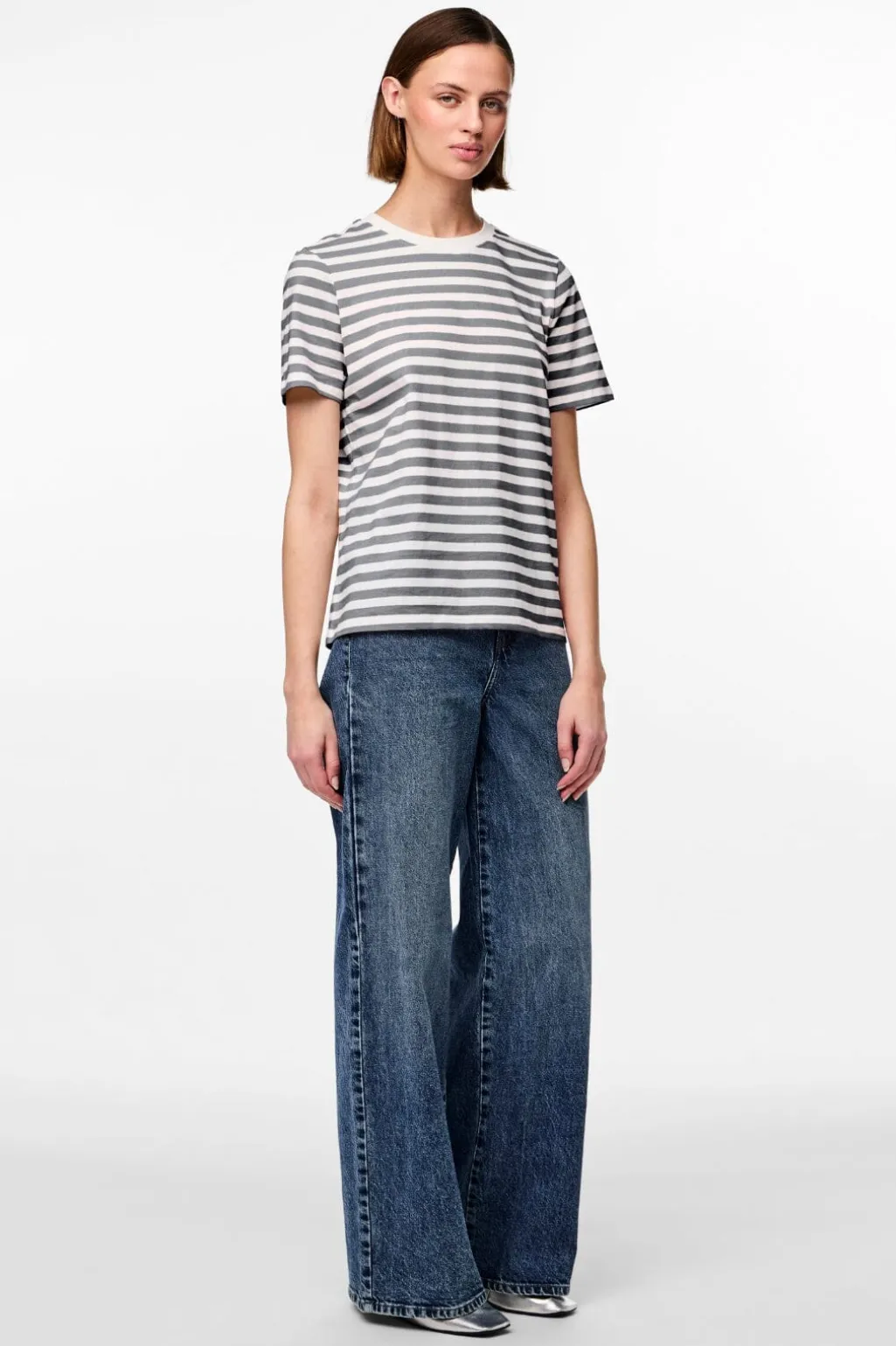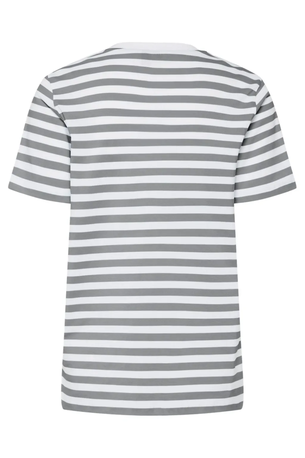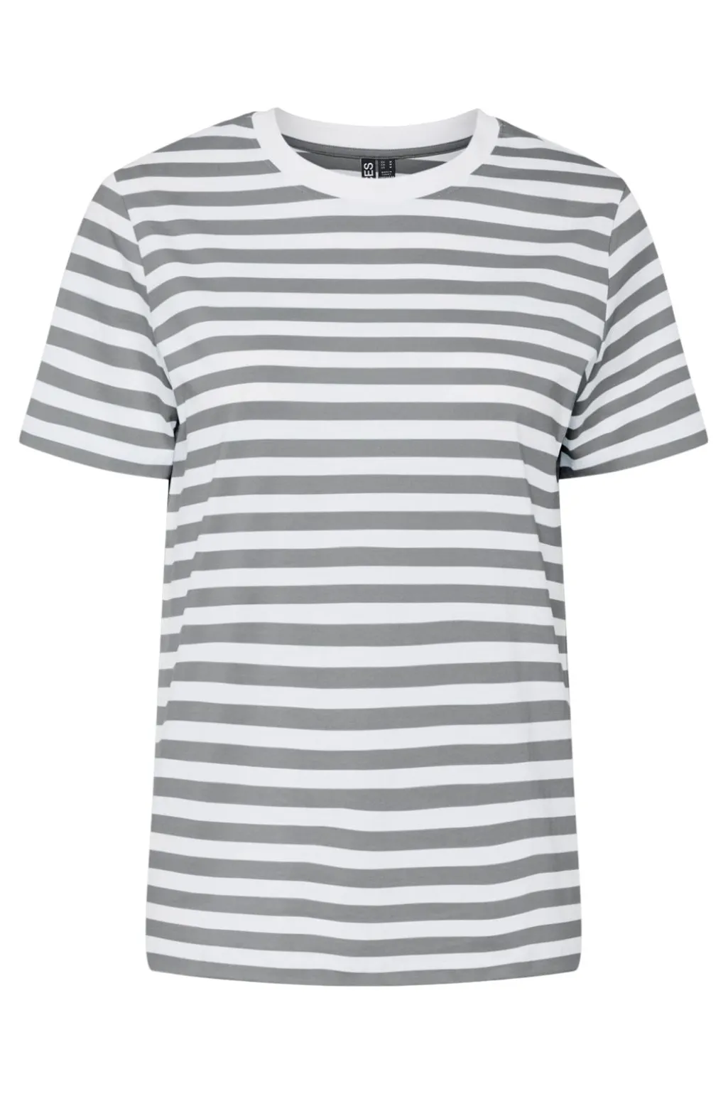Stribet t-shirt fra Pieces med vandrette grå og hvide striber. Den er lavet i en blød jersey-kvalitet af økologisk bomuld med rund halsudskæring og korte ærmer.