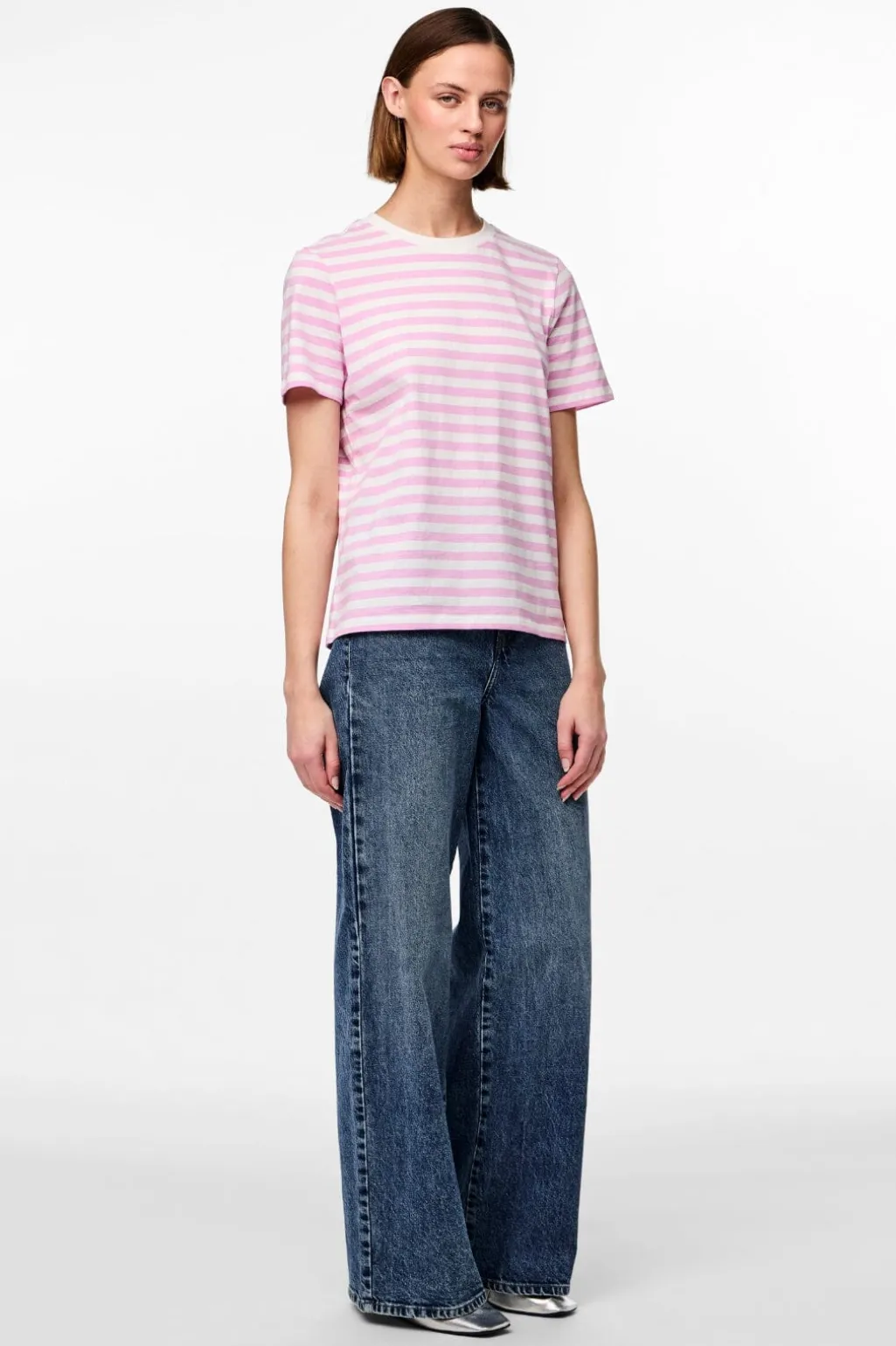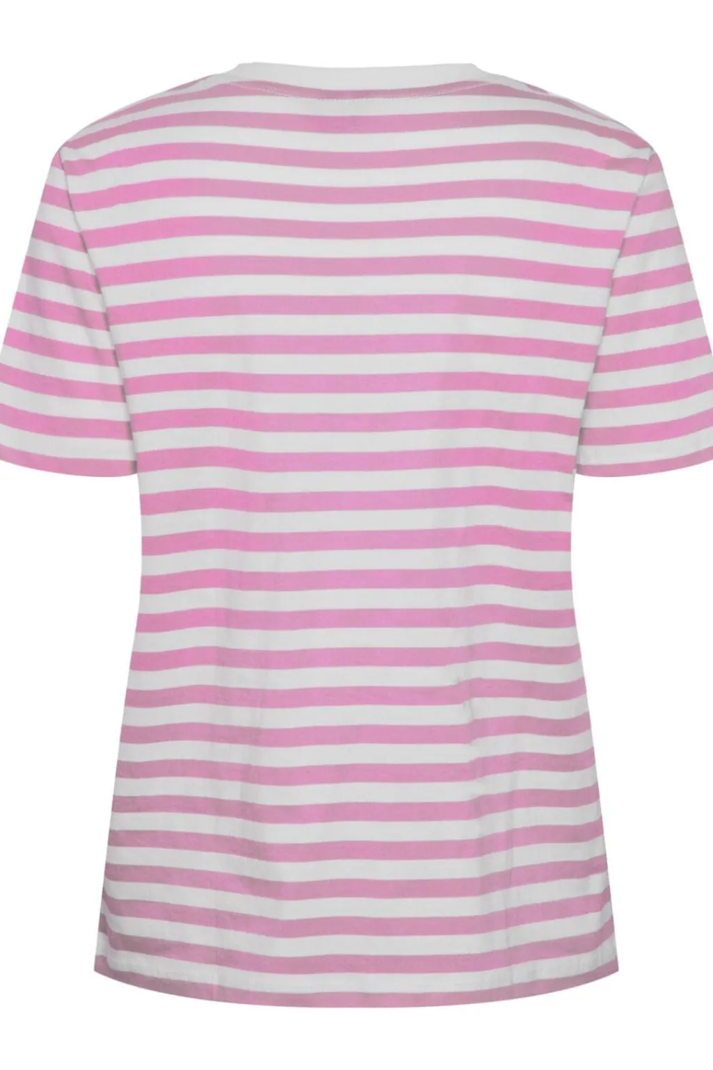 Stribet t-shirt fra Pieces med vandrette striber i pastel-lavendel og hvid. T-shirten har en løs pasform og rund hals med korte ærmer.
