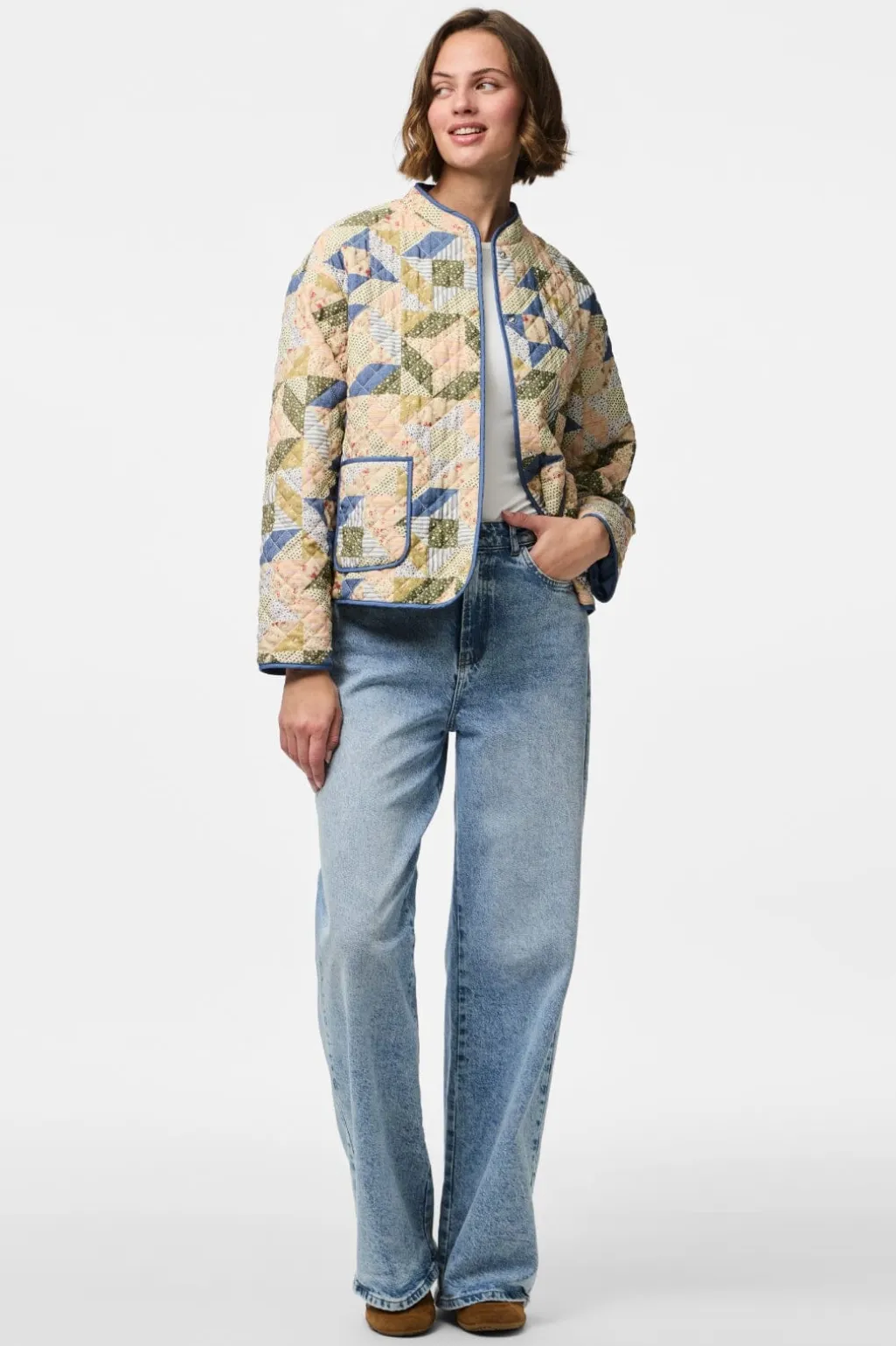 Quiltet jakke fra Pieces med et farverigt patchworkdesign i lyse farver. Jakken er lavet af 100 % viskose og har en rund halsudskæring.