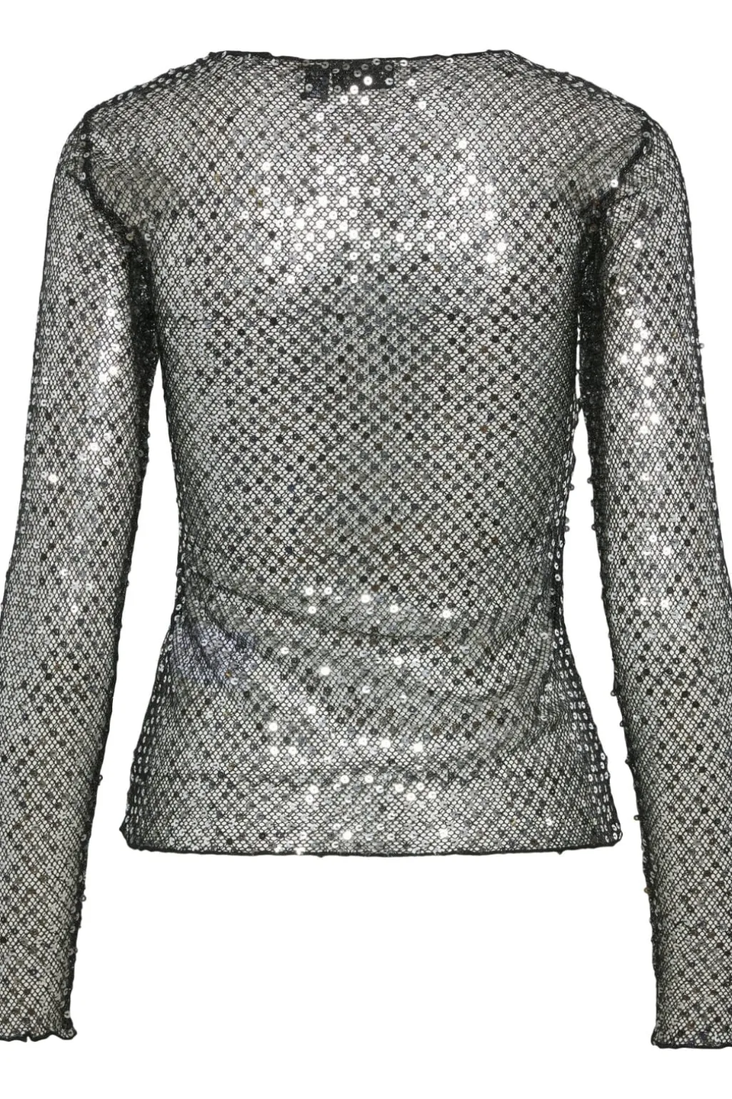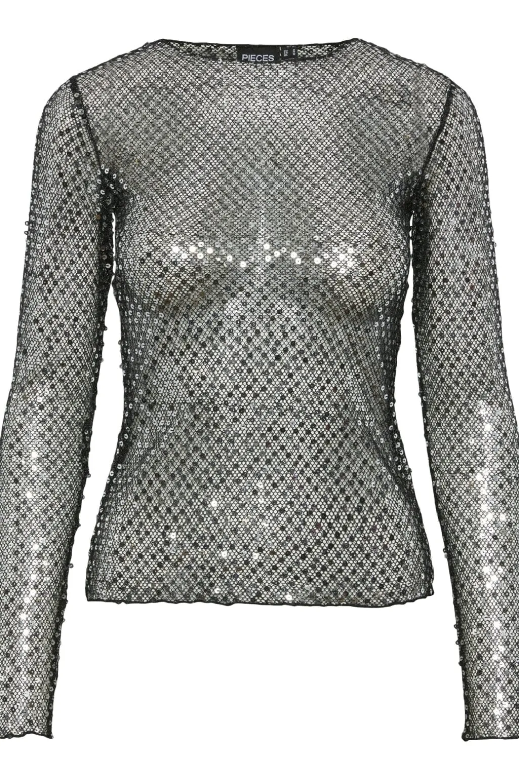 Langærmet top fra Pieces med gennemsigtig netstruktur og sort-sølv pailletter. Den har rund halsudskæring og regular fit.