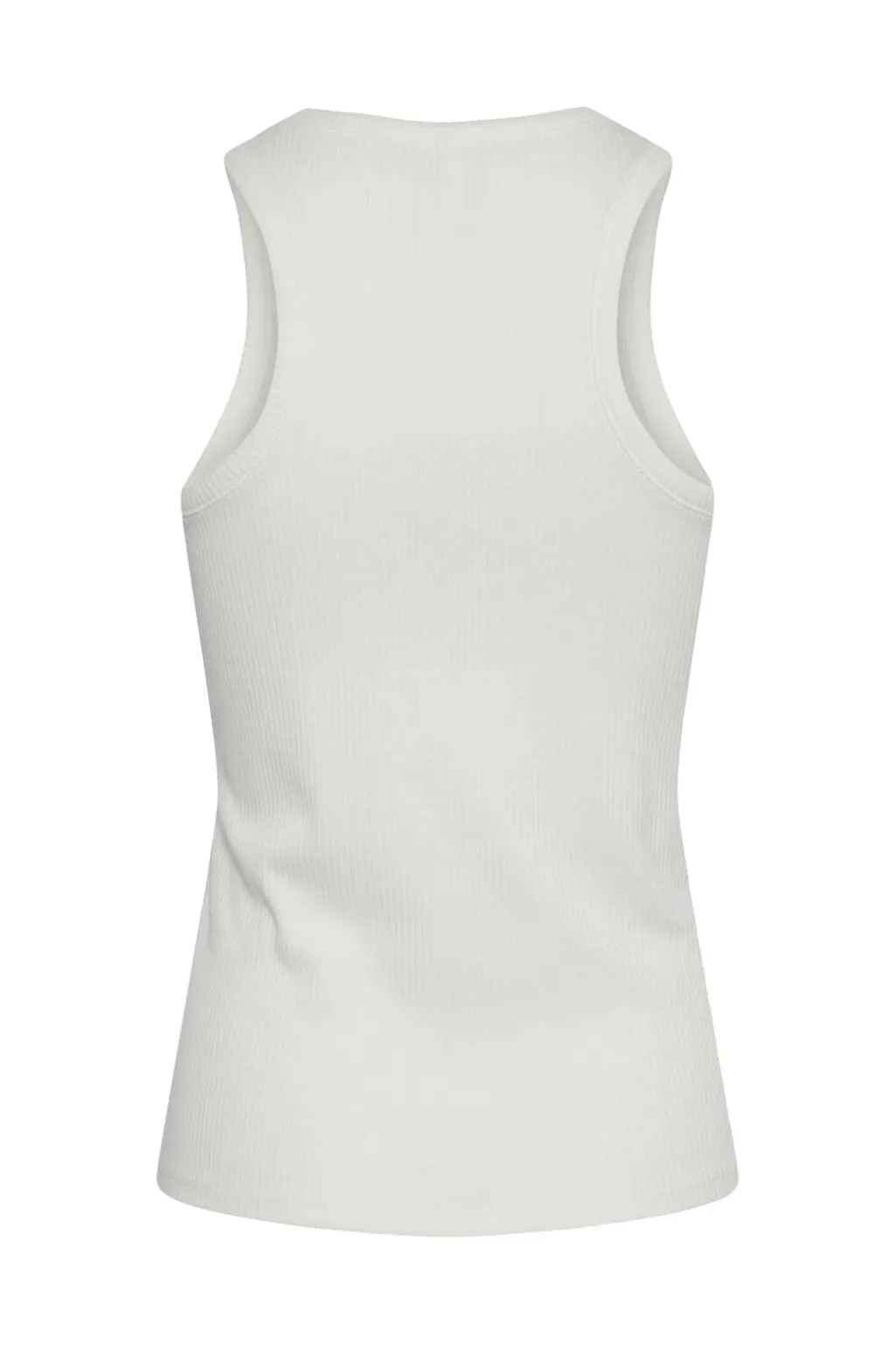 Cremehvid tanktop fra Pieces med brede stropper og ribbet tekstur. Toppen har en rund halsudskæring og en god pasform, der følger kroppens former.