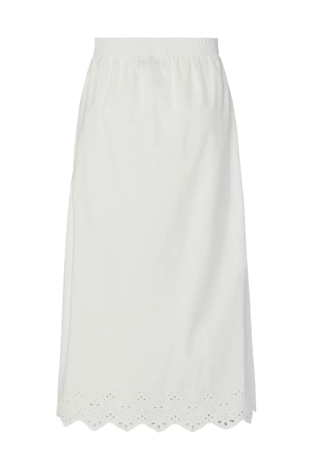 Hvidt ankelskørt fra Pieces med elastisk talje og broderet kant. Skørtet har en høj talje og en regulær pasform med dekorative syninger langs kanten.