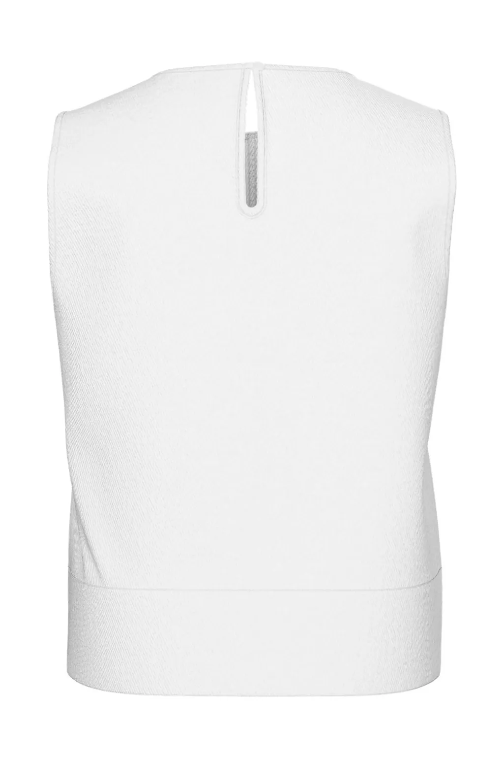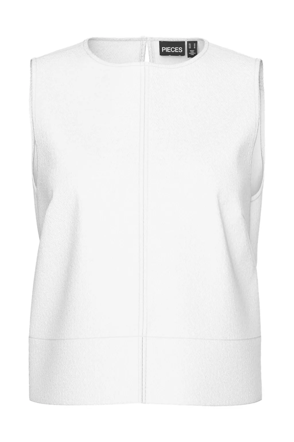 Hvid denimtop fra Pieces med rund halsudskæring og dekorative syninger. Toppen har en afslappet pasform og et ærmeløst design med nøglehulsdetalje i nakken.
