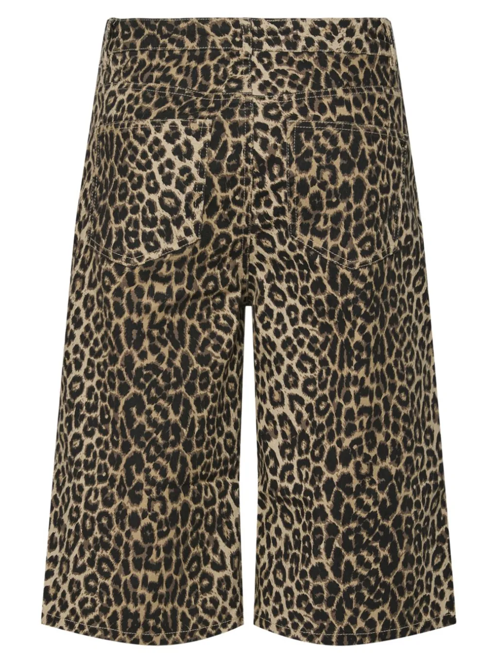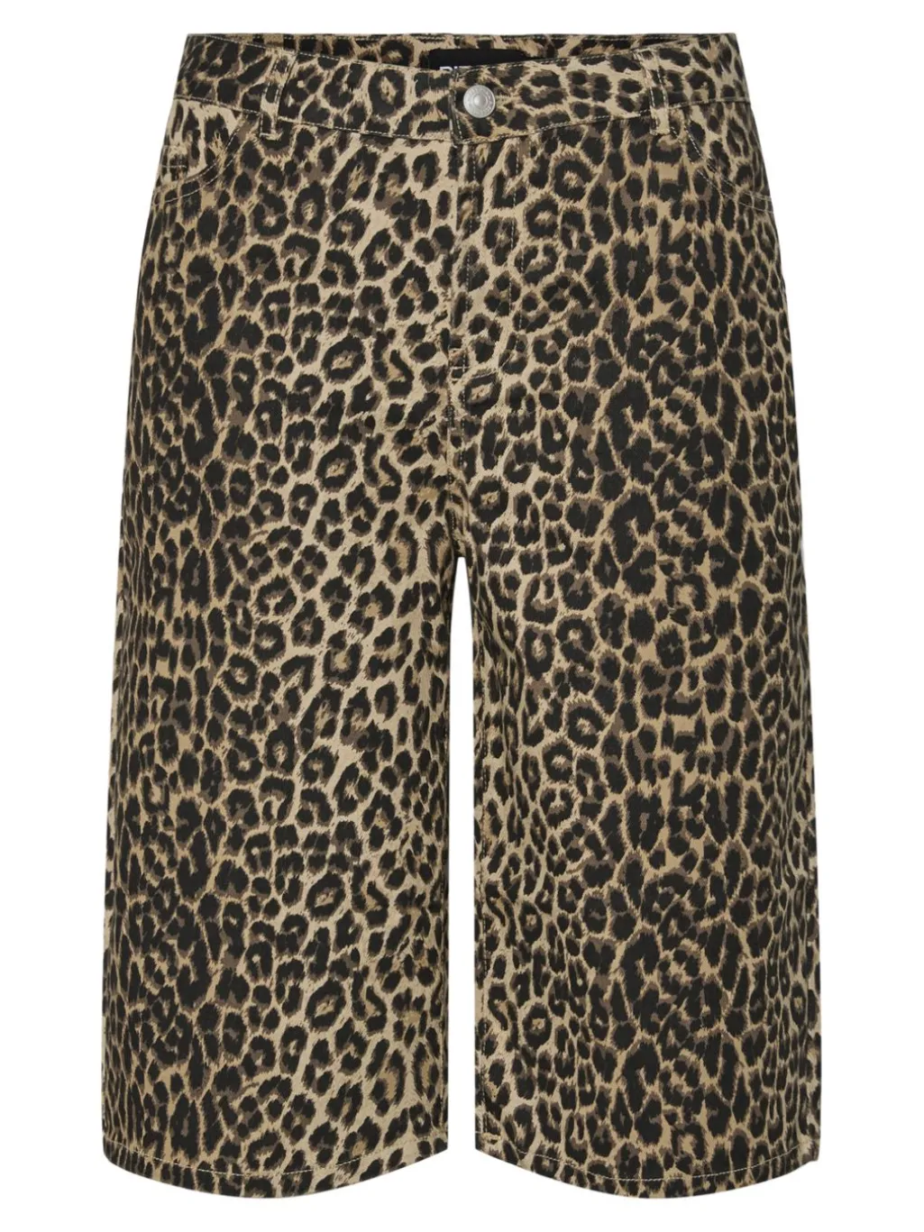 Denimshorts fra Pieces med leopardmønster i hvid og beige. Shortsene har en bred pasform og knapper som lukning.