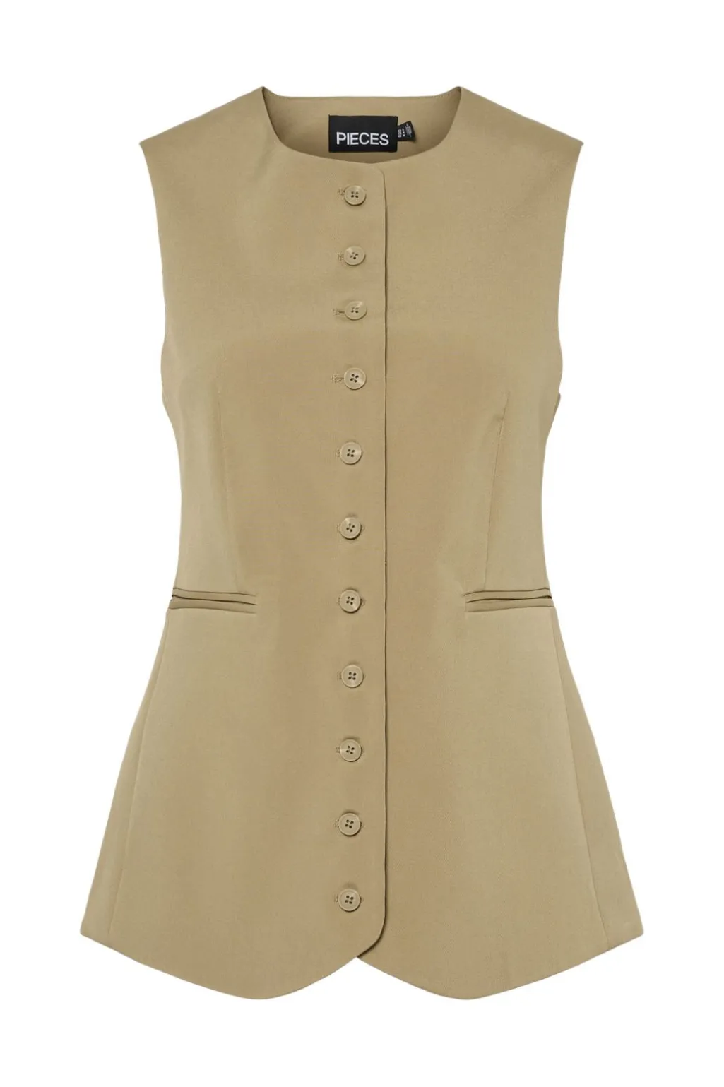 Lang vest fra Pieces i en lys beige nuance. Vesten har et figursyet snit med knaplukning foran og praktiske forlommer. Den kan styles til både hverdags- og kontorbrug.