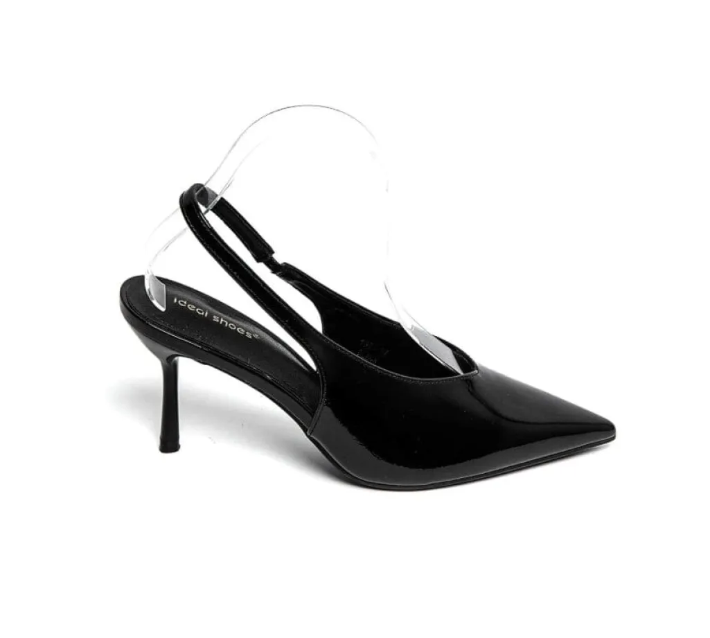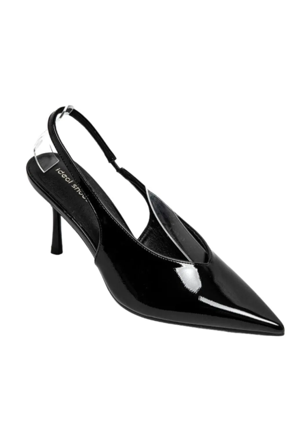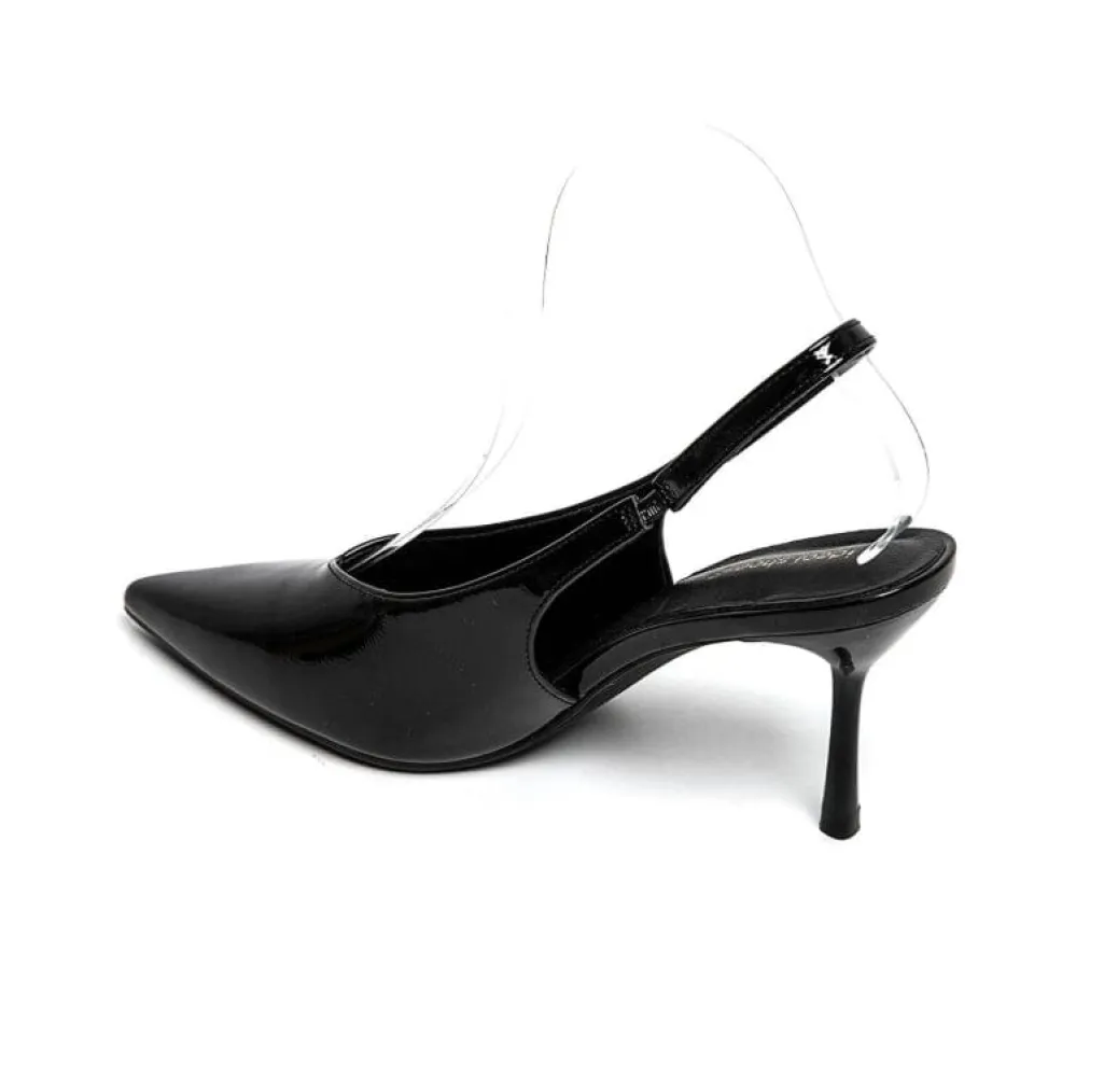 Sort stiletto fra Bloom med spids tå og slank hæl. Skoen har en skinnende overflade og elastisk lukning.
