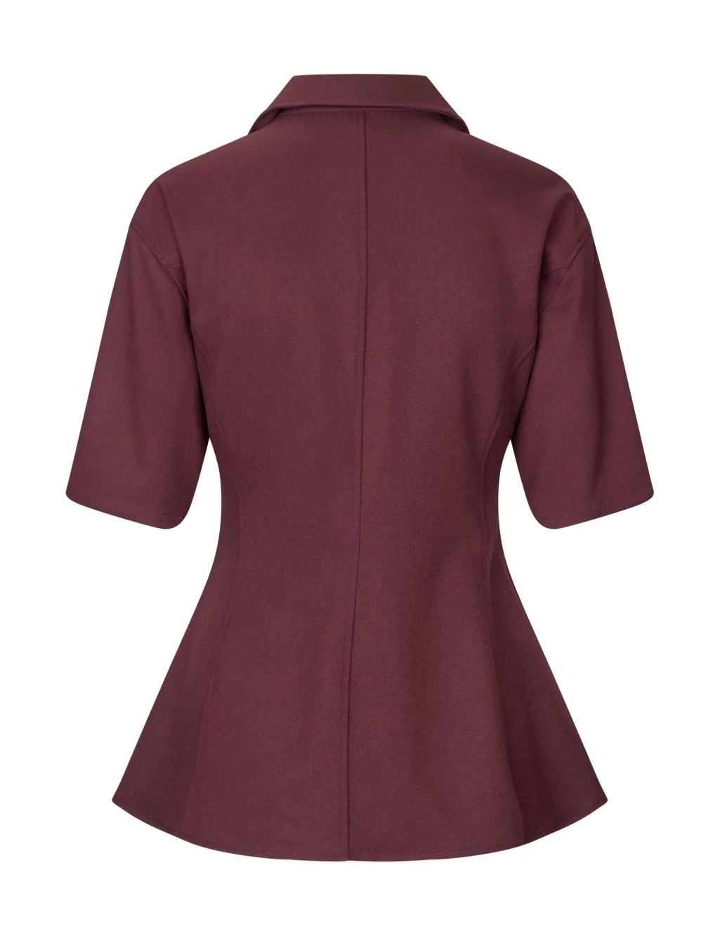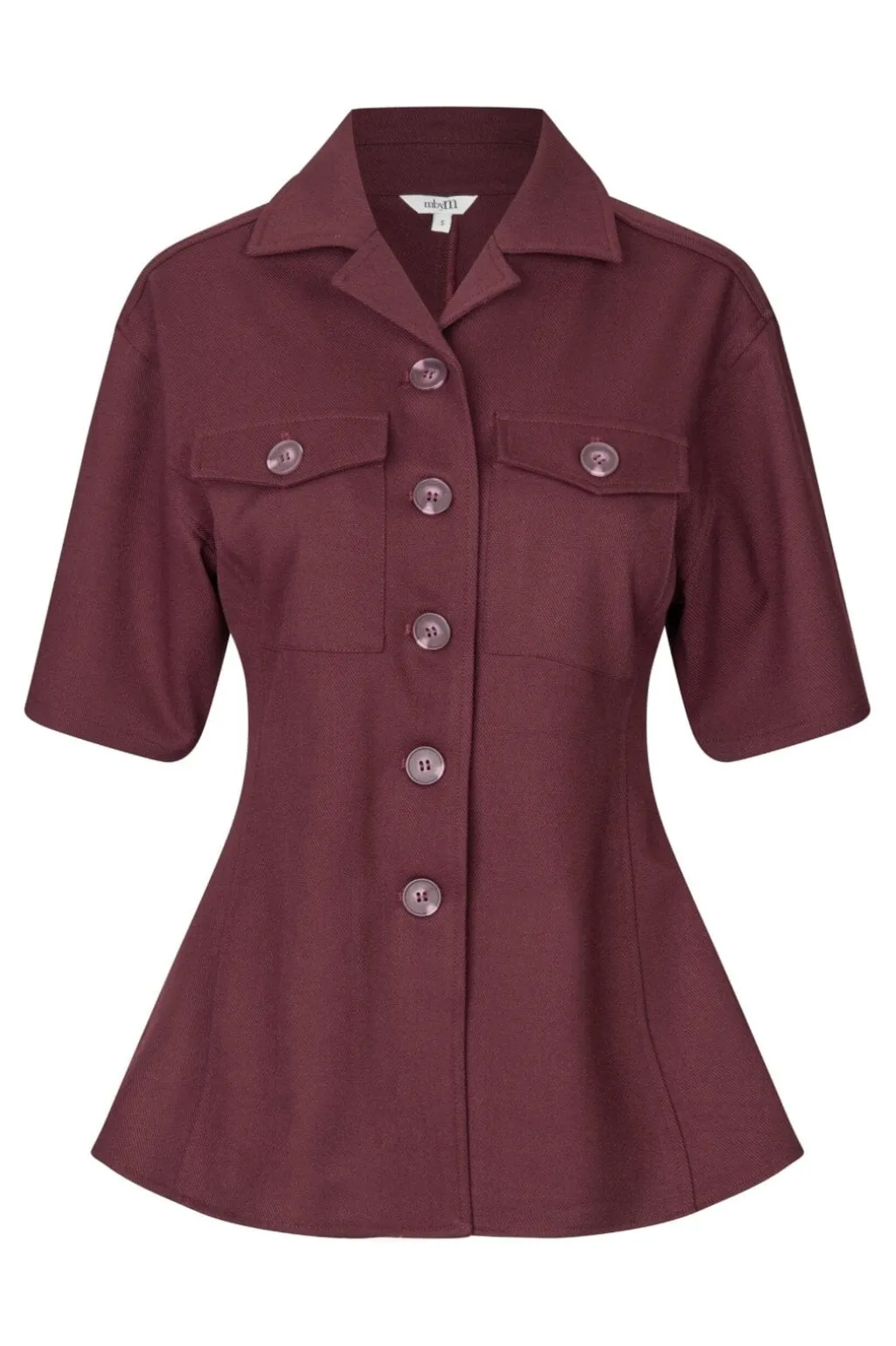 Mørkerød skjorte fra MbyM med knapper foran, klassisk skjortekrave og korte ærmer. Skjorten har to brystlommer og en let taljeret pasform.