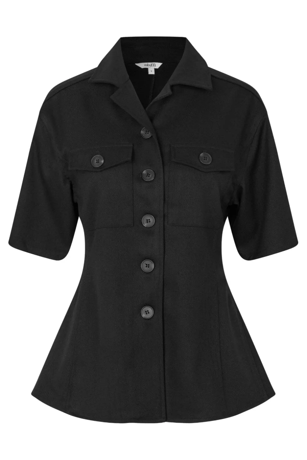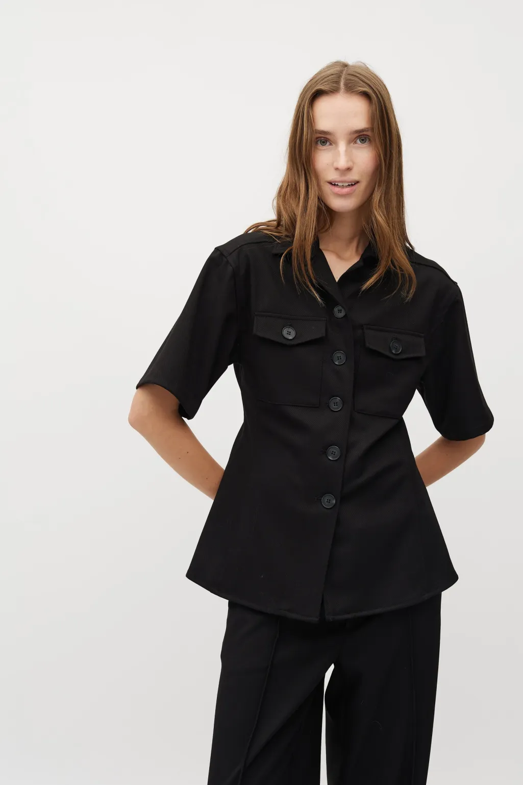 Sort skjorte fra MbyM i en polyesterblanding. Skjorten har en skjortekrave, korte ærmer og knaplukning foran med to brystlommer med knapper.