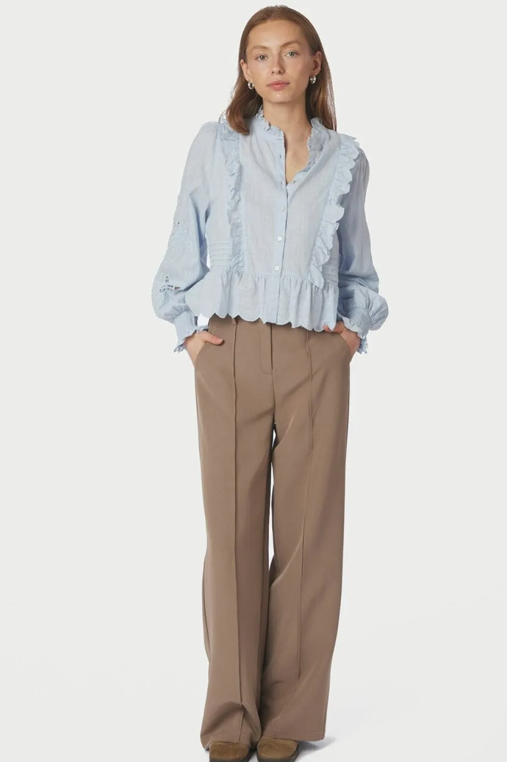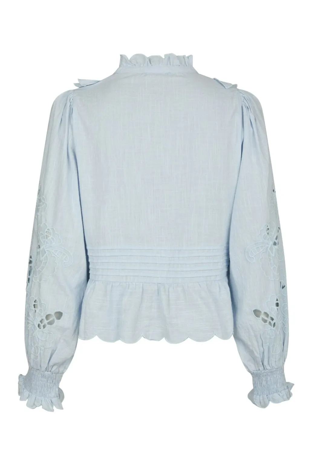 Lyseblå bluse fra Neo Noir, lavet af bomuld. Blusen har flæser langs knappelukningen og ved kraven samt broderede mønstre på ærmerne.