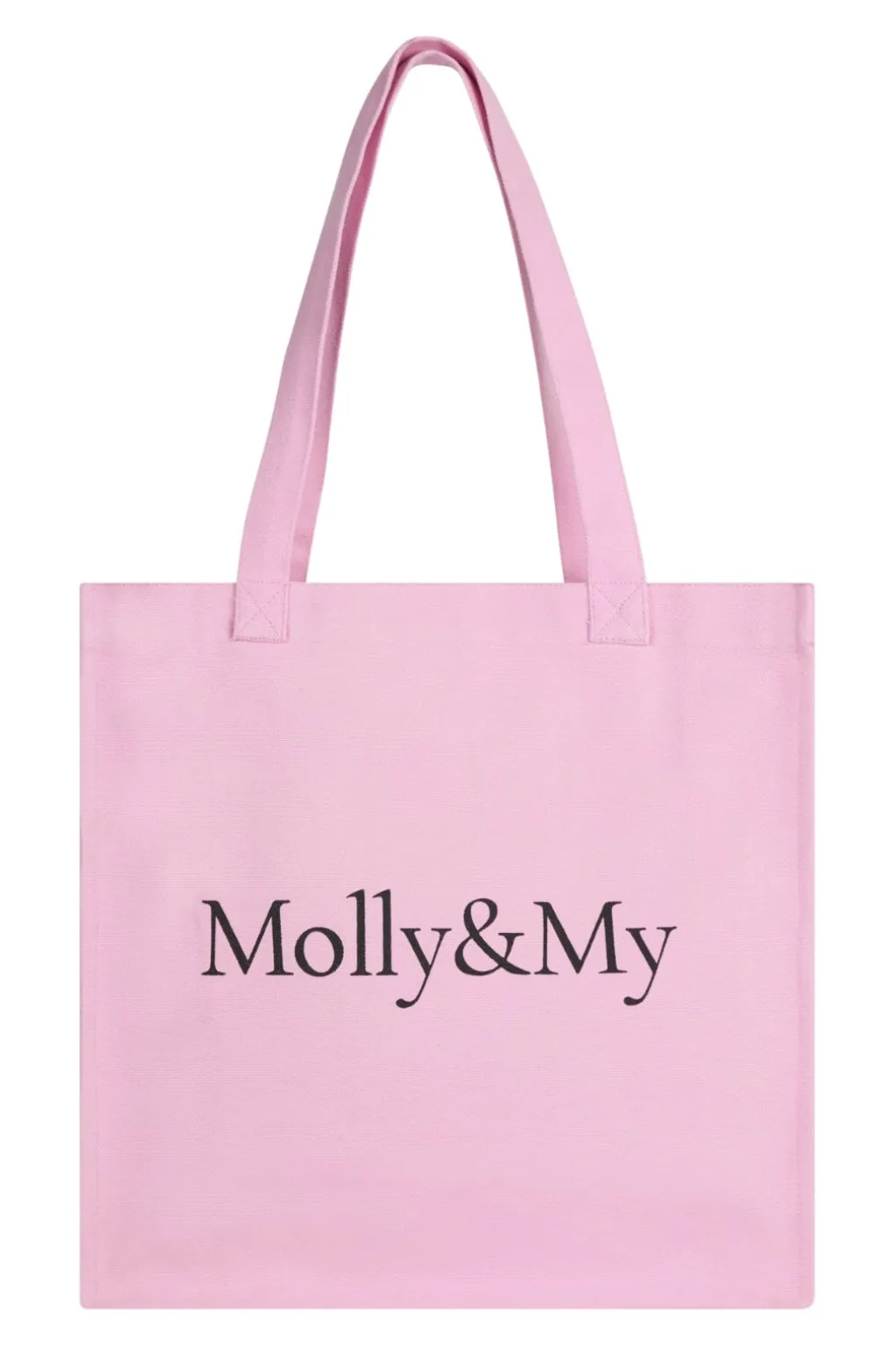 Pink tote bag fra Mellow Moon med rektangulær form. Tasken har et enkelt design med sort Molly&My-logo på forsiden og lange bærehanke.