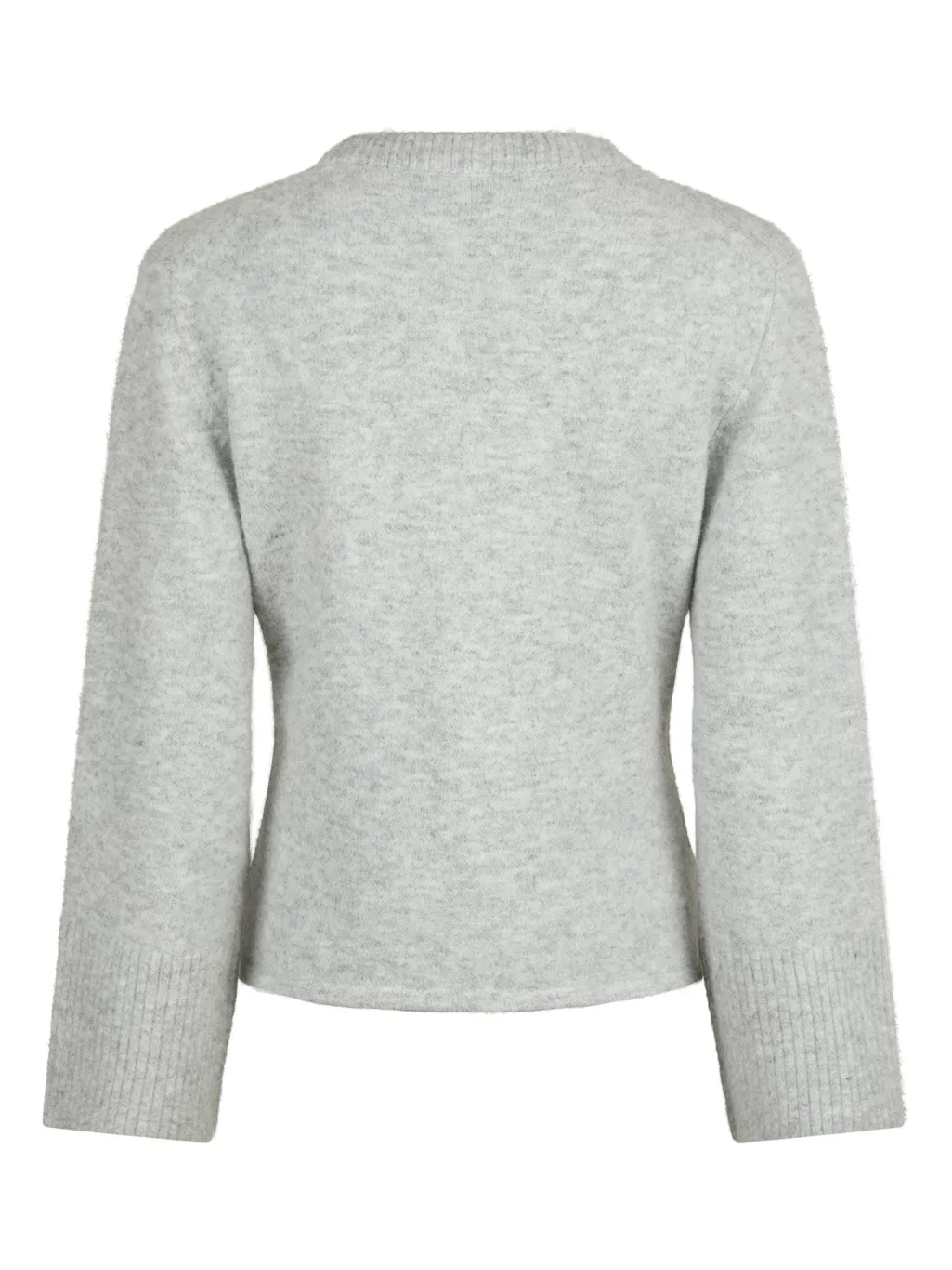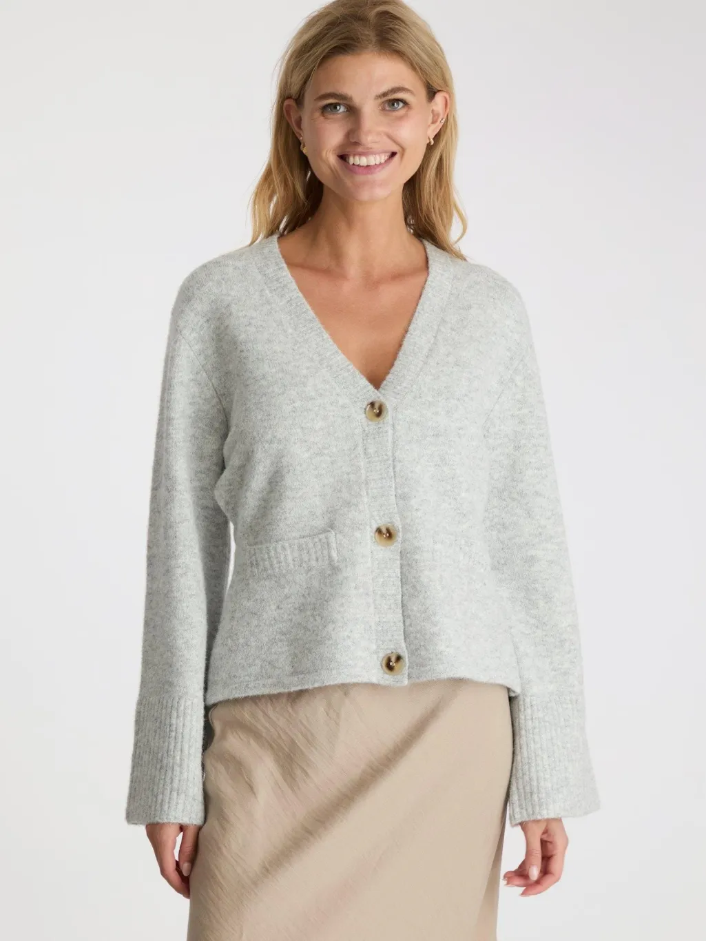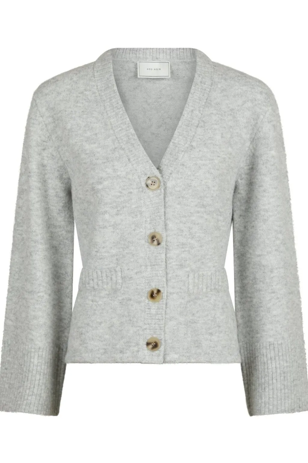 Lys grå strikket cardigan fra Neo Noir med V-hals og fire knapper foran. Den har lommer i siderne og lange ærmer med ribkant ved manchetterne.